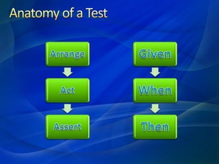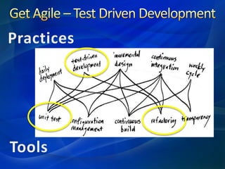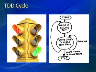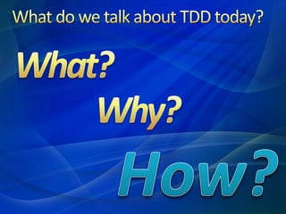 The document discusses test-driven development (TDD) and design-driven development (DDD). It advocates for writing tests before code using short iterative development cycles. TDD helps produce clean code that fulfills requirements by making developers think about required behavior, providing documentation, and improving quality. Common objections to TDD are addressed, noting that it forces understanding of code and tests, creates reusable modular code, and drives simplicity. Guidelines for effective TDD include writing small focused tests with descriptive intentions that are independent and repeatable.