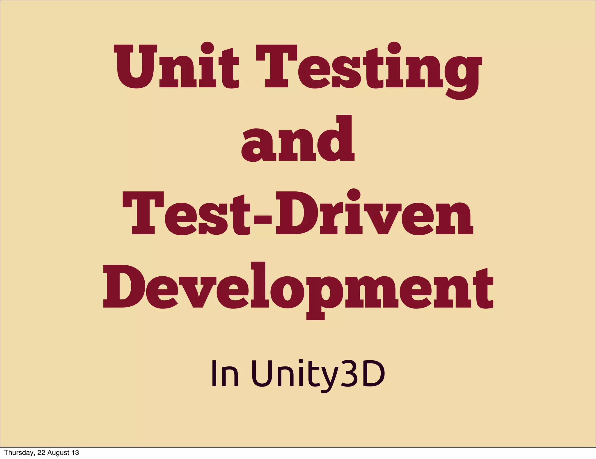 The document discusses unit testing and test-driven development (TDD) within Unity3D, emphasizing definitions and distinctions between unit tests and integration tests. It outlines the TDD process, which involves writing a failing unit test, making it pass, and then refactoring the code, while also noting the benefits of adopting TDD for improving code quality and development efficiency. The principles of model-view-controller architecture and dependency injection are highlighted as essential for facilitating TDD in Unity development.