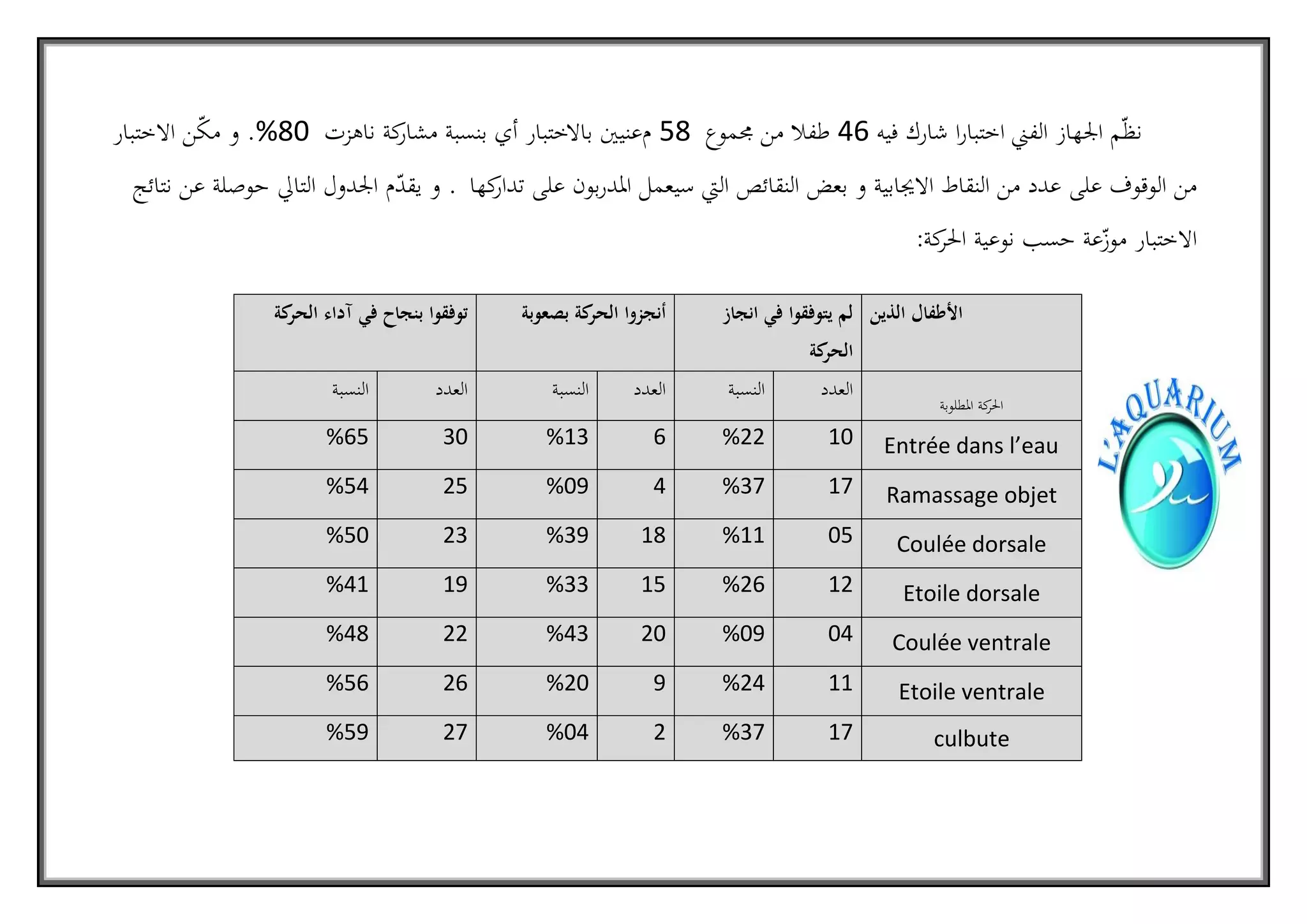 اختبر الجهاز 64 طفلا من أصل 85، مما يمثل نسبة 80% من المعنيين، حيث أظهر الاختبار نقاط إيجابية ونقائص سيتم معالجتها من قبل المدربين. تم تصنيف نتائج الأطفال حسب الأداء في مهارات السباحة، حيث تحقق 56% منهم من أداء جيد في المهارة الحرة. بينما أظهرت نتائج أخرى تفاوتاً في الأداء عبر باقي المهارات، وهناك حاجة لتحسينات واضحة في بعض المجالات.