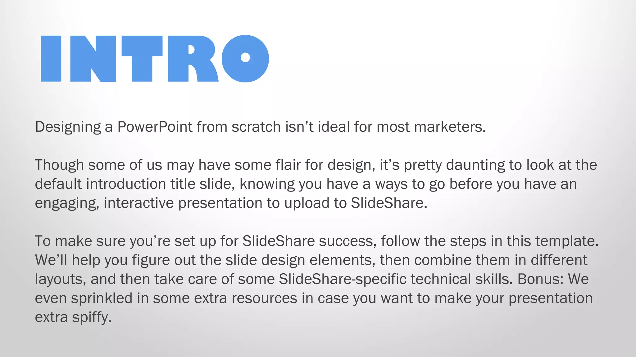 This document provides tips for creating effective PowerPoint presentations for SlideShare. It discusses designing slides with engaging visual elements like fonts, colors, stock photos, icons, and screenshots. It then presents different slide layouts to mix these elements, such as cover slides, header slides, and bullet point slides. Finally, it offers technical tips for SlideShare, including how to create "animated" slides by building up elements across multiple slides since SlideShare does not support PowerPoint animations. The goal is to help users design professionally-looking presentations that will succeed on SlideShare.