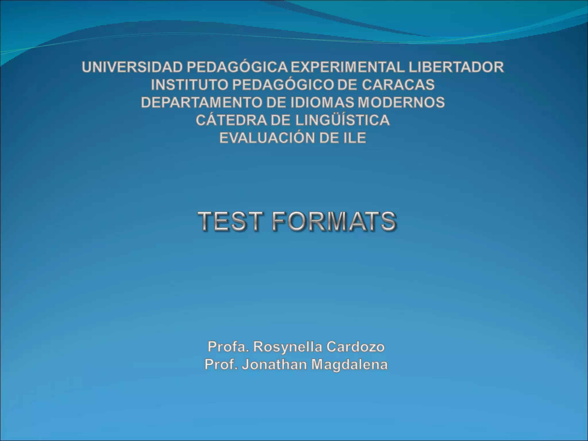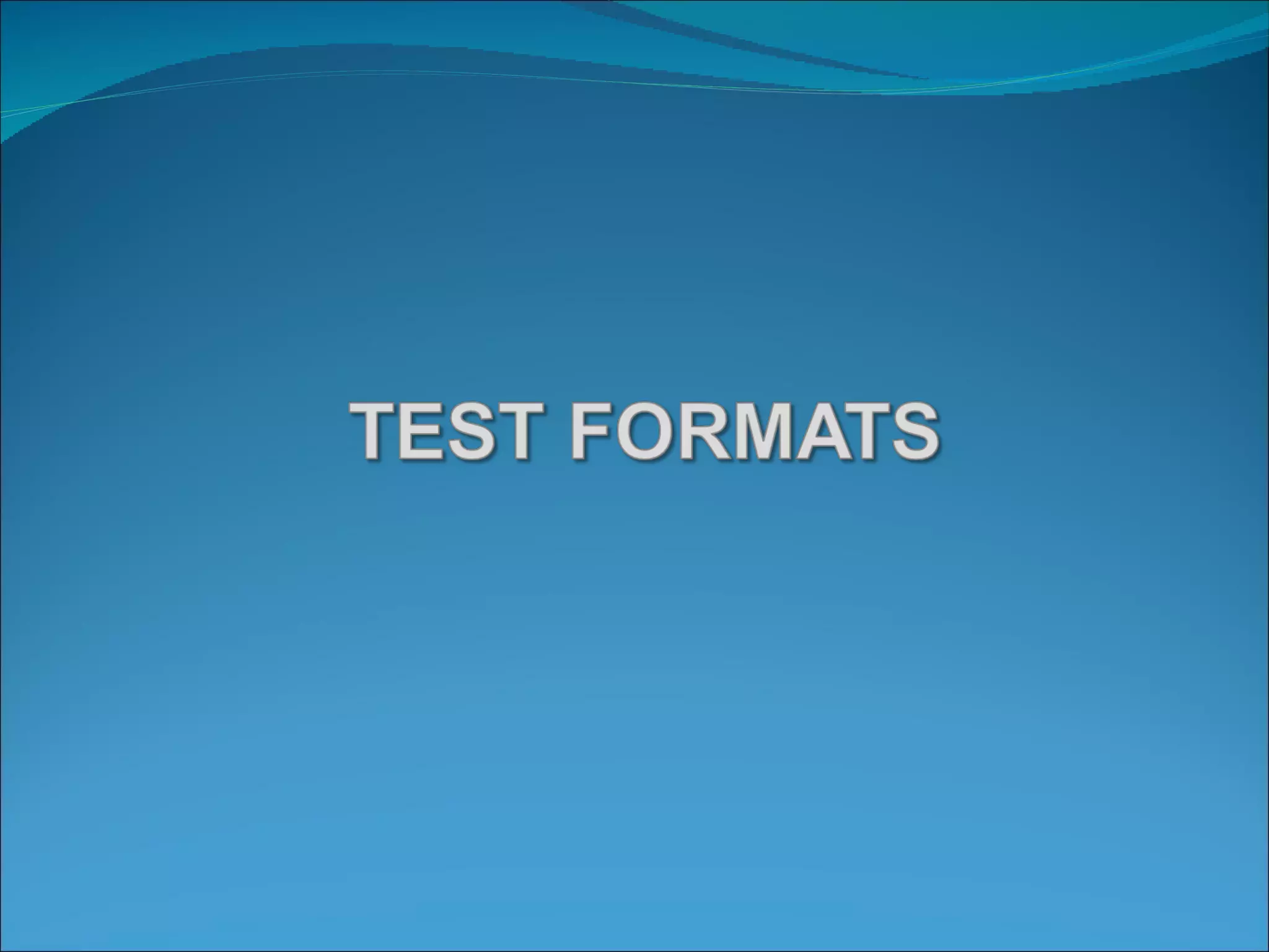 Test items can be designed in various formats, with different formats having more validity and reliability than a single format like multiple choice. Common test formats include questions about reading or listening passages, true/false statements requiring evidence, multiple choice, fill-in-the-blank, matching, dictation, sentence rewriting, translation, and essay writing. Well-designed tests use a variety of formats to comprehensively assess different skills.