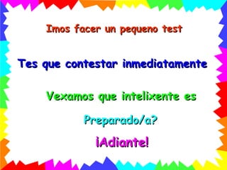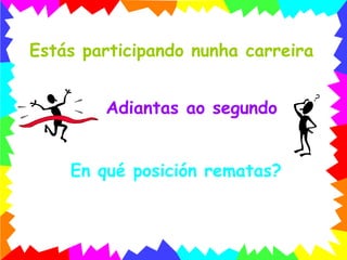 Se contestaches queen primeira ……. Estás absolutamente equivocado(a) Adiantaches ao segundo, e colliches o seu lugar, polo tanto, chegas en segunda posición. Por favor para a seguinte pregunta Non tardes tanto tempo en contestar!