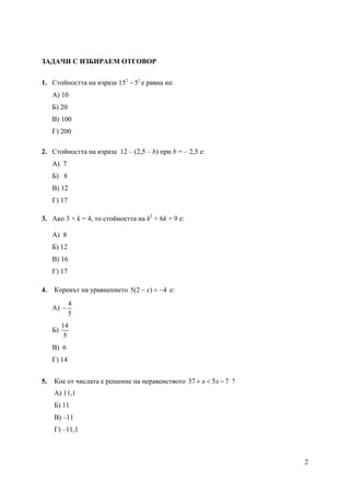 2. Стойността на израза 12 – (2,5 – b) при b = – 2,5 е: