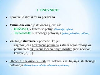 Dnevnice za tujino Zaposamezno državo (oz. mesto): določa PrilogaUredbe o povračilu stroškov za službena potovanja v tujino(URL RS, št. 83/94 in dopolnitve) Preračun dnevnic: referenčni tečaj Evropske centralne banke (ECB), ki ga objavlja Banka Slovenije (BS), na zadnji dan potovanja VIŠINA dnevnice glede na trajanje službenega potovanja: