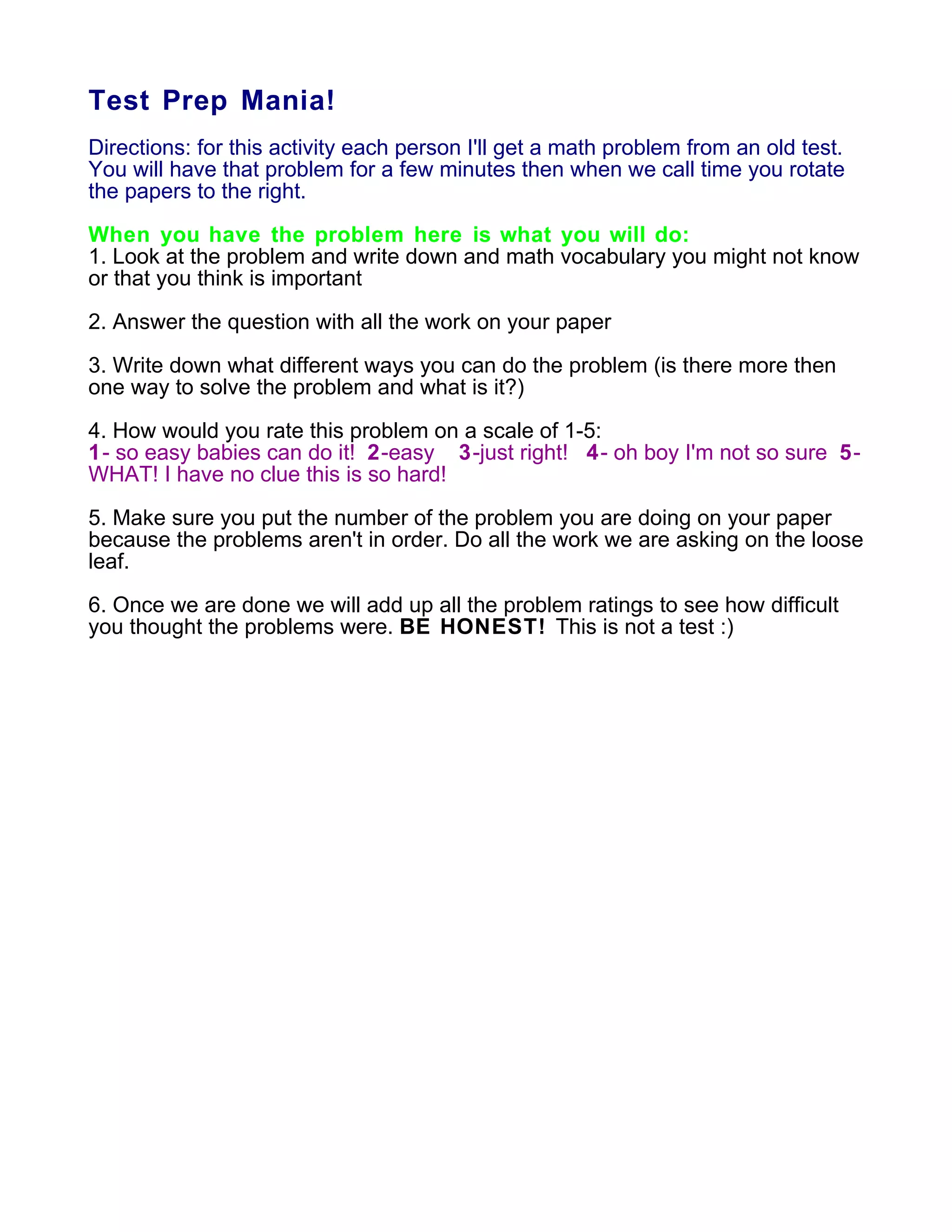 1) Students will rotate through math problems from old tests, spending a few minutes on each problem before passing their paper to the right. 2) For each problem, students should write down any important math vocabulary, answer the question with their work, and note any alternative ways to solve the problem. 3) Students should then rate the difficulty of each problem on a scale of 1 to 5 and put the problem number on their paper.