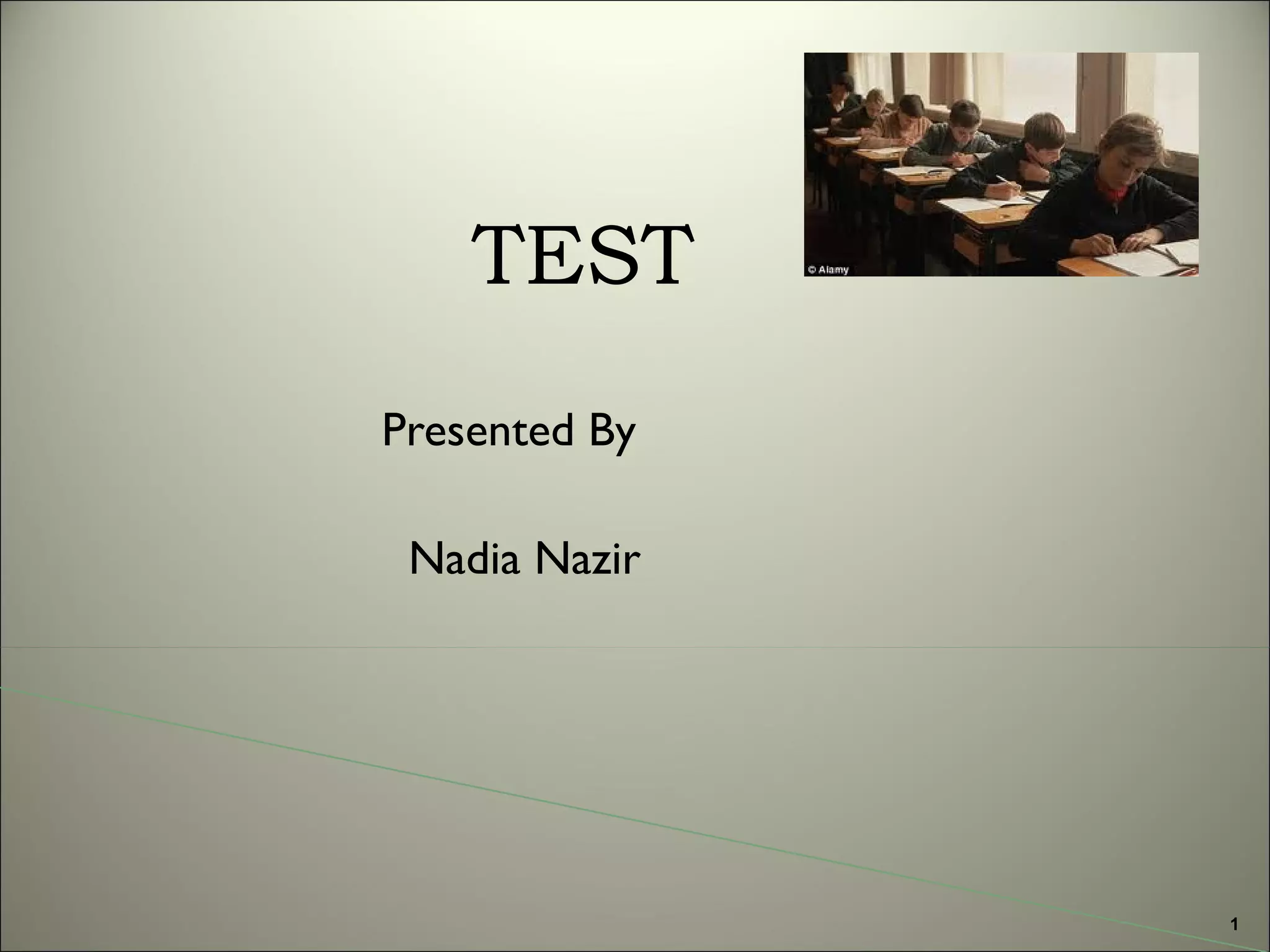 This document discusses test design and provides guidance on creating effective test items and questions. It defines tests as a means to measure individual or group knowledge, skills, feelings, or aptitude. Tests are categorized as either objective items, which require selecting or supplying short answers, or essay questions, which permit longer form responses. The document provides tips for writing different question types, considerations for item difficulty and test specifications, and strategies for improving learning through test design.