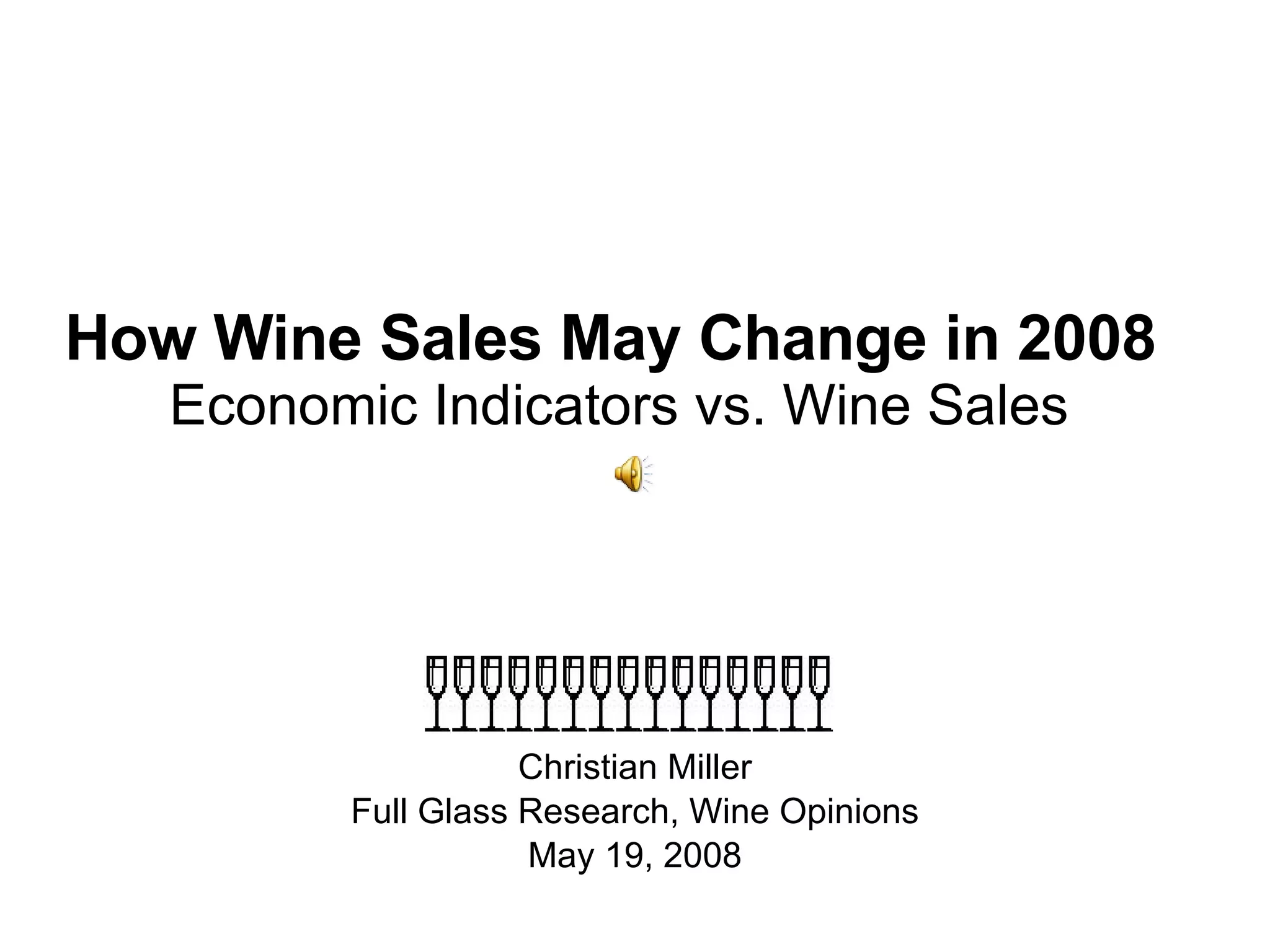 The document discusses how the economy may impact wine sales in 2008. It reviews historical data showing a weak negative correlation between economic indicators like unemployment and wine sales. Academic research shows income elasticity of demand is below 1.0 for wine volume but mixed for higher-end wines. The core wine-drinking demographic tends to be older, wealthier consumers, but a recession may still reduce their spending. Several factors like channels of purchase and business spending are uncertain and require monitoring in terms of effects on the wine industry.