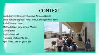 The document summarizes an English lesson for 6th grade students in a rural area of Colombia. It includes the context, constructs, goals, and activities for the lesson. The lesson focuses on reading comprehension, writing, and speaking skills using present simple tenses. Activities include reading a short text and answering comprehension questions, writing about their daily routine, and doing an oral presentation on their daily routine. It provides rubrics to assess the students' writing and speaking skills.