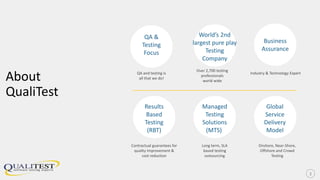 Qualitest is the world's second largest pure play testing company, specializing in QA and testing services with over 2,700 professionals globally. The document discusses the need for continuous improvement of the software testing process using the business-driven Test Process Improvement (TPI) model, which evaluates key areas such as stakeholder commitment, test strategy, and communication. It emphasizes the importance of ongoing evaluation and adaptation of testing methodologies to align with organizational changes and enhance software quality.