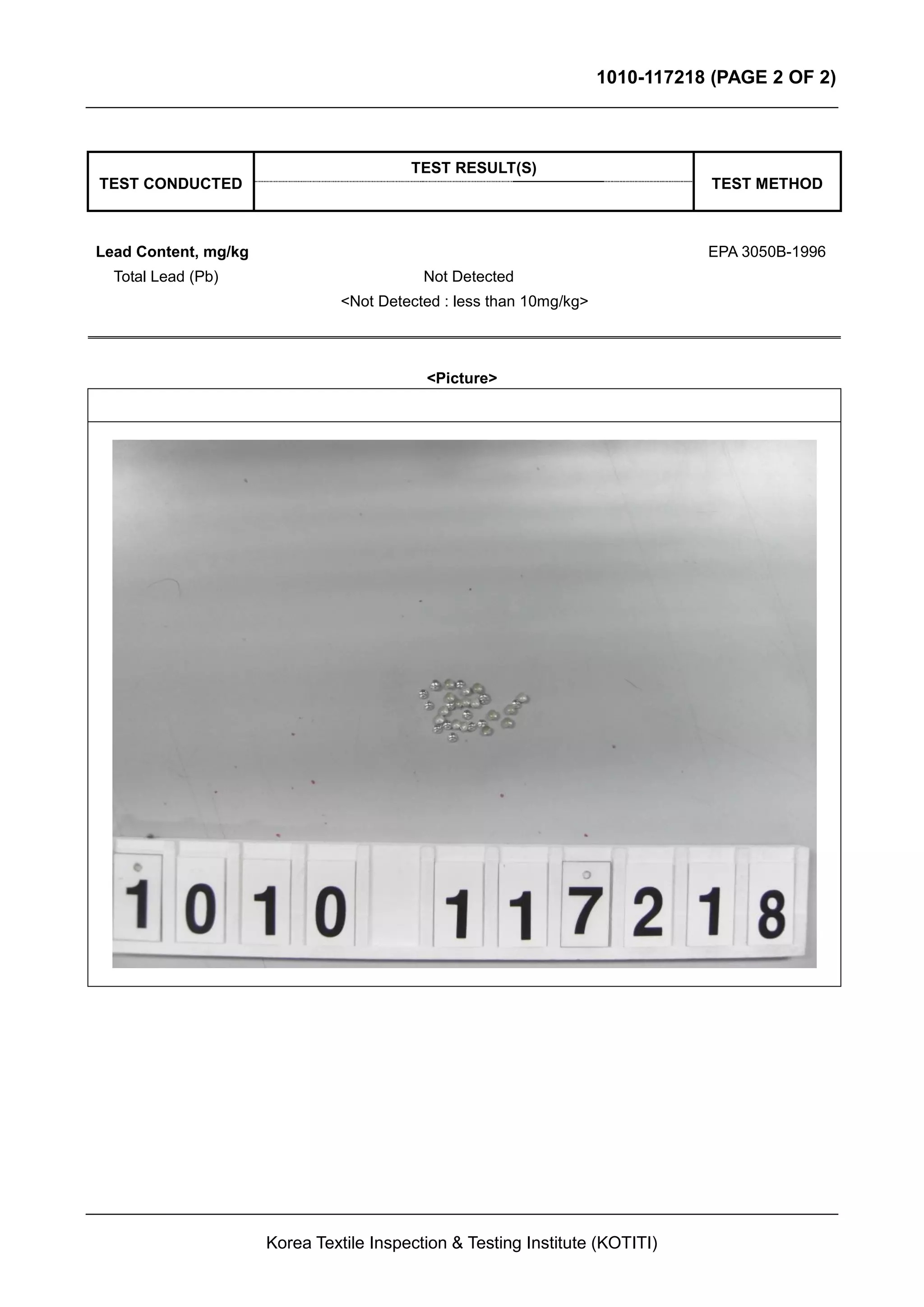 The test report summarizes results from testing conducted by Korea Textile Inspection & Testing Institute on a silver half round hotfix item submitted by Amazing Co., Ltd. Testing found that the total lead content was not detected and was less than 10mg/kg, as measured using EPA test method 3050B-1996. Contact information is provided for Mi Gyeong So, the report preparer, and backup contact Chan Soon Jeong.