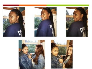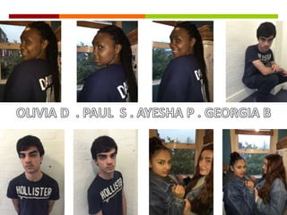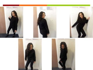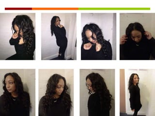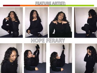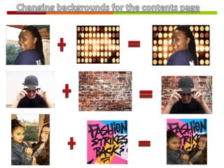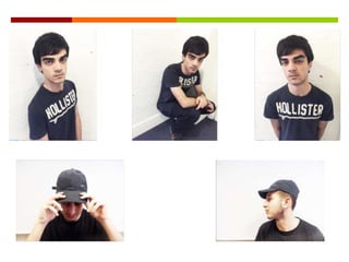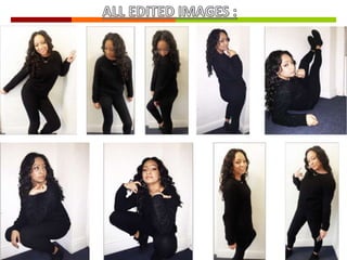 The document discusses the selection of various images for a magazine cover and spread. It describes choosing images that are clear and professional, as well as selecting shots like medium close-ups that allow readers to see the featured artists more clearly while creating intrigue. The photos are also adjusted in Photoshop to be sharper and brighter. Poses are selected that represent genres or position artists as looking at the reader to attract them. Images are inspired by poses from other artists meant to portray dominance, power and attract attention through their vibe.