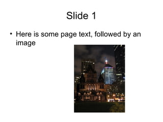 This 3 slide presentation includes images and text on each slide. The first slide has image and accompanying text. The second slide contains a two item list. The third slide applies a visual effect to one word and includes alternative text for accessibility.