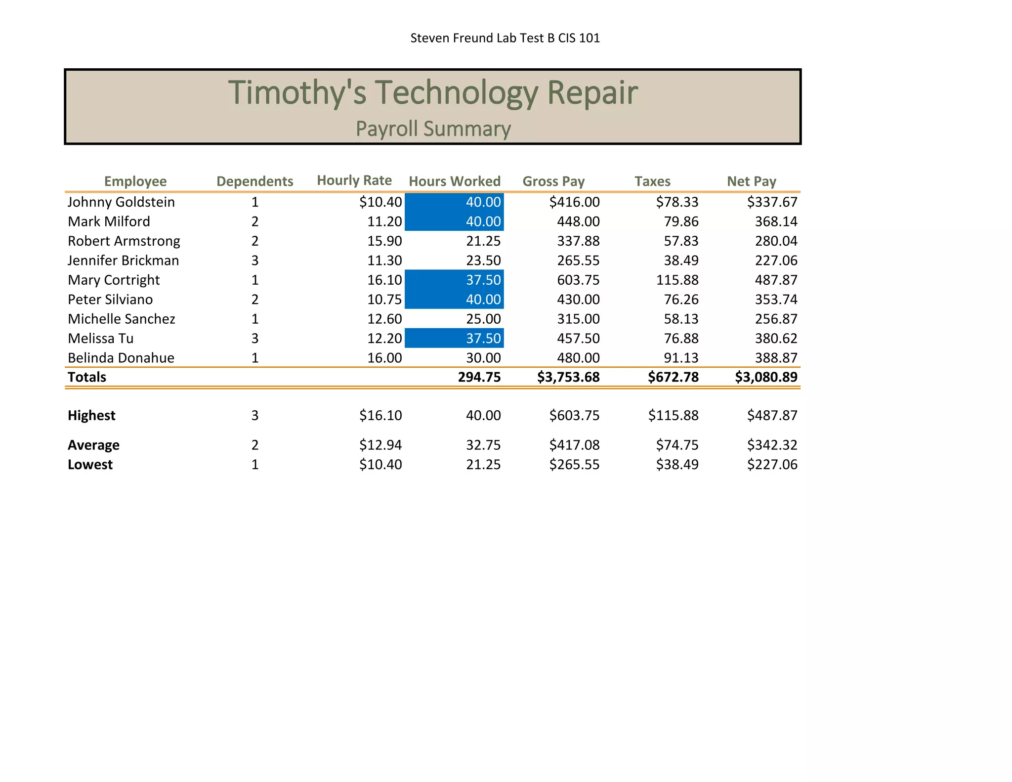 This payroll summary shows employee names, dependents, hourly rates, hours worked, gross pay, taxes, and net pay for nine employees of Timothy's Technology Repair. Totals are provided for all employees as well as averages for dependents, hourly rate, hours worked, and pay. The employee with the highest pay is listed along with the employee with the lowest pay.