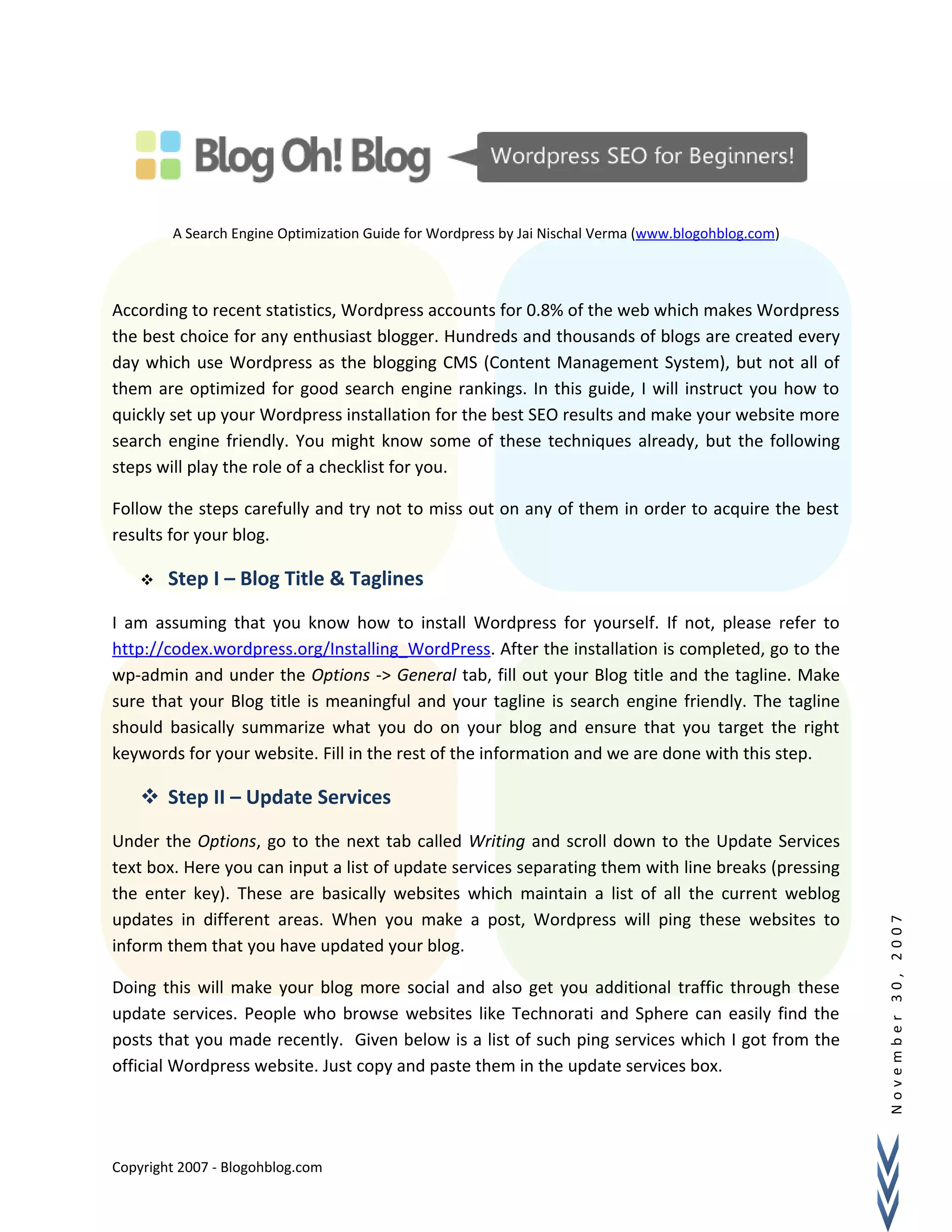 The document provides an 8-step guide for optimizing a WordPress blog for search engine optimization. It recommends filling out blog title and tagline, using update services, modifying title tags, adding meta tags with plugins, enabling pretty permalinks, optimizing keywords, adding a Google sitemap, and using social bookmarking plugins. The goal is to make the blog more search engine friendly to increase traffic and rankings.