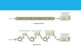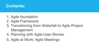 The document outlines a comprehensive guide to agile project management, discussing key principles, methodologies, and practices such as the agile manifesto, user stories, and iterative delivery. It emphasizes the importance of collaboration, customer satisfaction, and adaptability in delivering high-value software through frameworks like Scrum and Kanban. Additionally, it covers the roles of Scrum Master and Product Owner, the dynamics of cross-functional teams, and strategies for transitioning from traditional waterfall to agile processes.