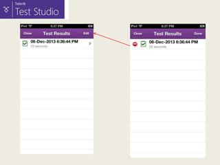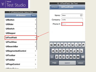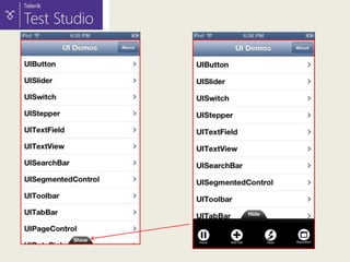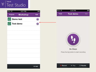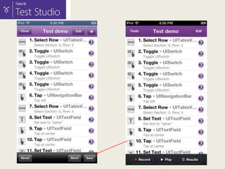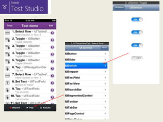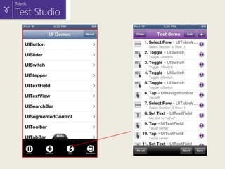 This document provides an overview of Test Studio, an automated testing tool from Telerik. It allows creating automated tests for web, desktop, and mobile applications without code. For mobile testing, it supports iOS applications. Key features include test recording, data-driven testing, test execution and reporting. The document then focuses on using Test Studio for iOS, covering test creation, recording, and execution steps against both web and native iOS applications.