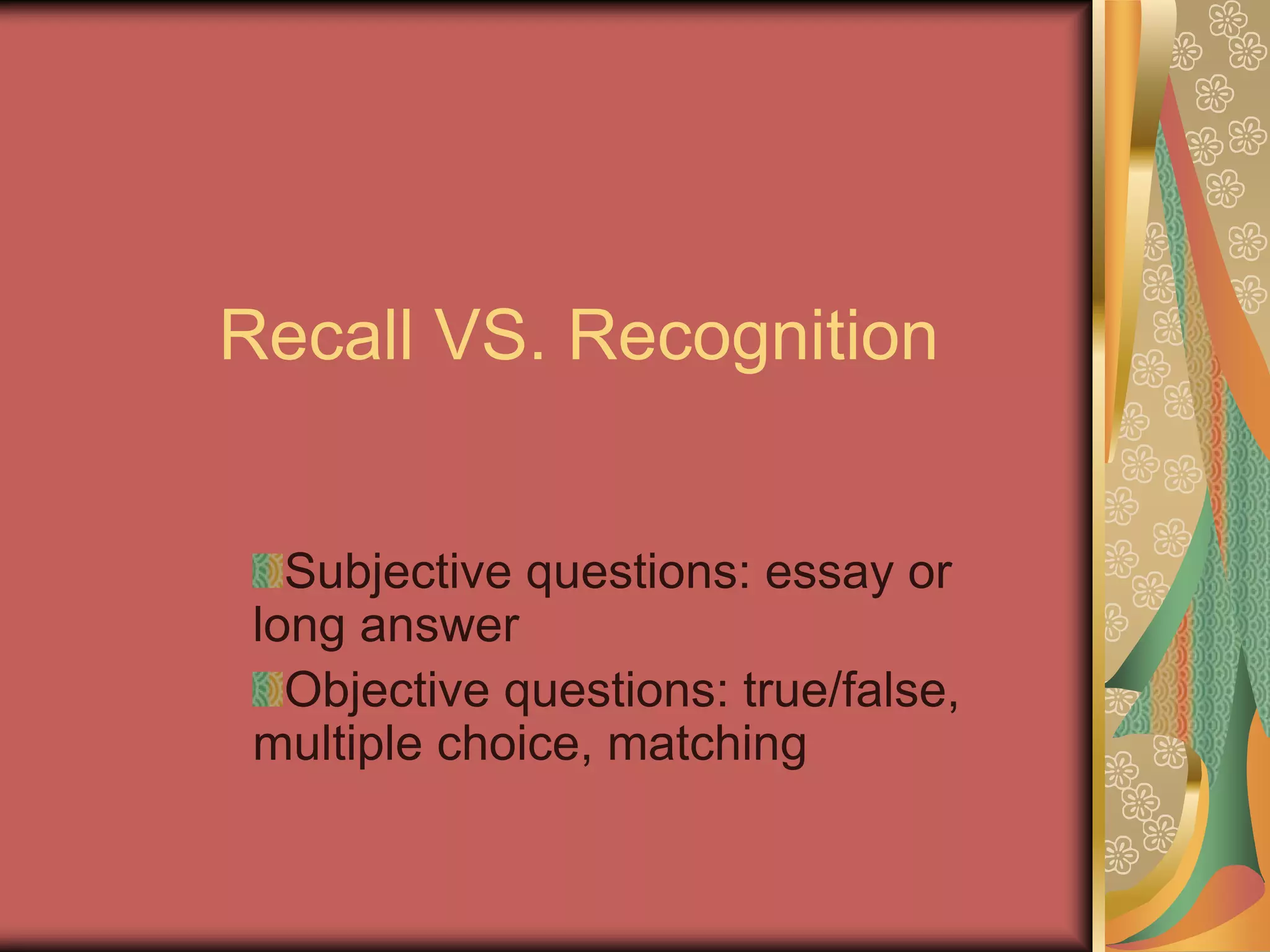 Recall questions require students to freely generate answers through essays or long responses, while recognition questions involve selecting correct answers from multiple choices, true/false statements, or matching columns. Recognition questions involve identifying the right answer from distractors rather than generating the answer, and require considering all parts of multiple choice questions as well as avoiding qualifiers for true/false statements. Matching questions should be answered carefully from top left to avoid compounding wrong guesses.