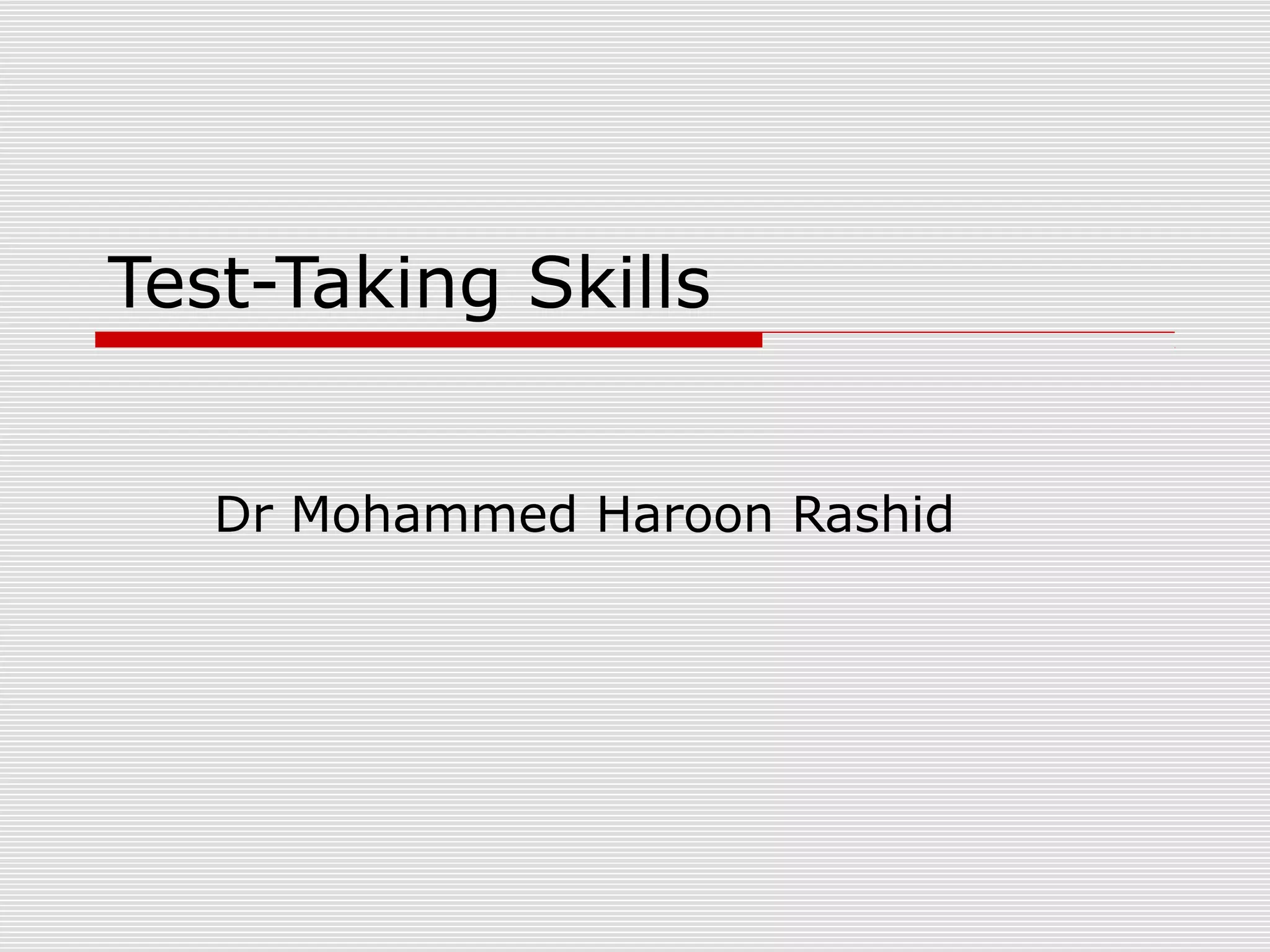 This document provides test-taking strategies and tips. It discusses putting tests in perspective by not stressing over results. Good preparation includes being physically and mentally ready, understanding the test format, and joining study groups. Different tests require tailored strategies, such as process of elimination for multiple choice and outlining ideas for essays. The document warns against cheating and advises recovering from failures by critically analyzing weaknesses and improving strategies.