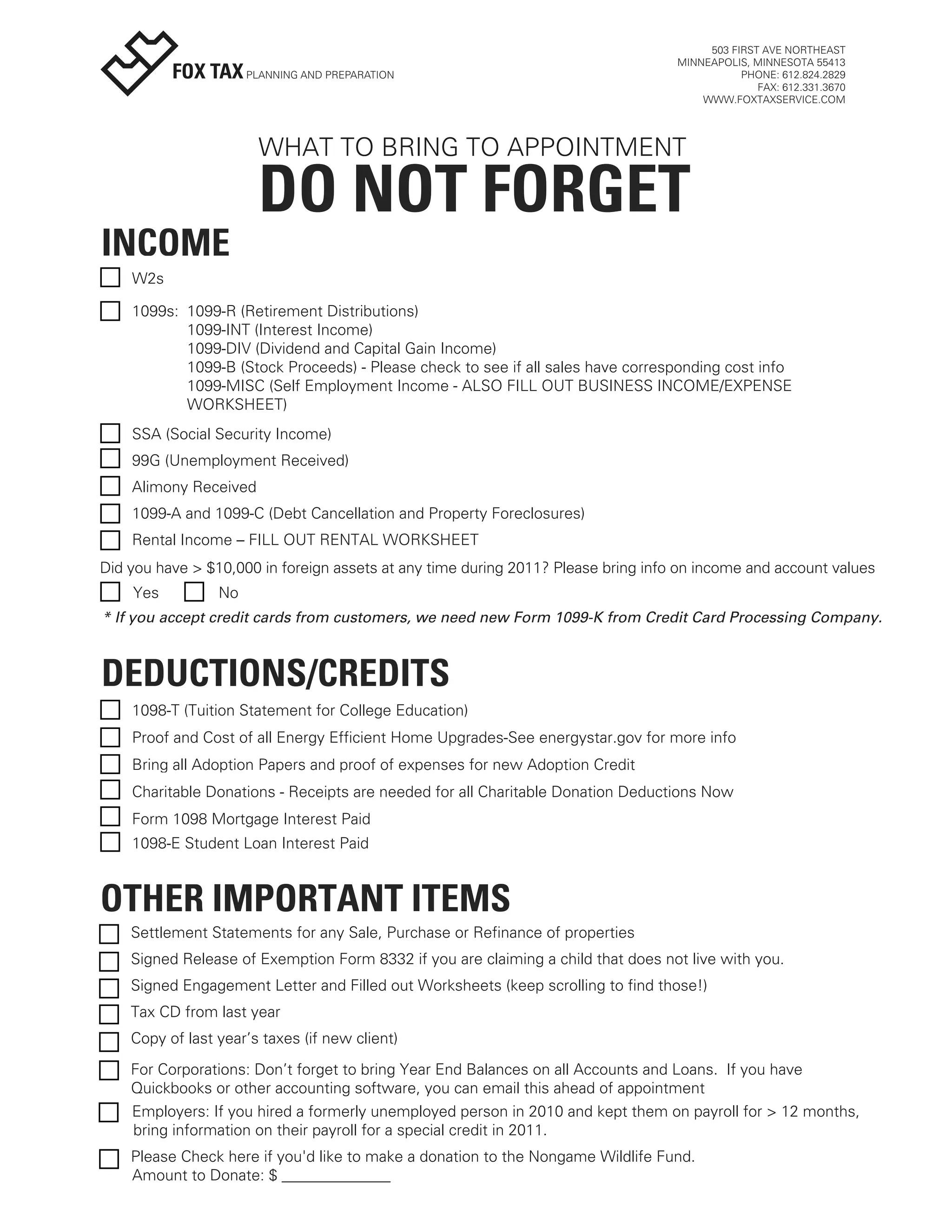 The document provides instructions and forms for clients to bring to their tax preparation appointment. It lists important income documents like W-2s, 1099s, and records of deductions and credits. It also includes a tax preparation worksheet to collect client details, and worksheets to track business, rental, and home office expenses. The engagement letter outlines the scope of tax preparation services and responsibilities of both the client and preparer.