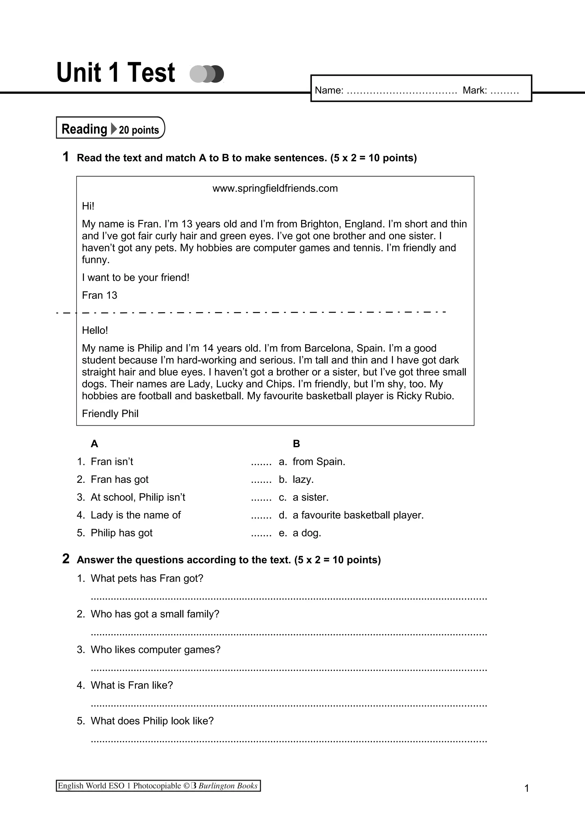 This document appears to be a sample test for students studying English as a foreign language. It covers topics of reading comprehension, vocabulary, grammar and writing. In the reading comprehension section, students read short profiles of two teenagers named Fran and Philip and answer multiple choice and short answer questions about details in the texts. The vocabulary section tests words related to appearance, family and items. The grammar section focuses on verbs, pronouns and articles. Students are tasked with filling in blanks and choosing correct answers. Finally, the writing section instructs students to describe themselves, including their age, appearance and personality.