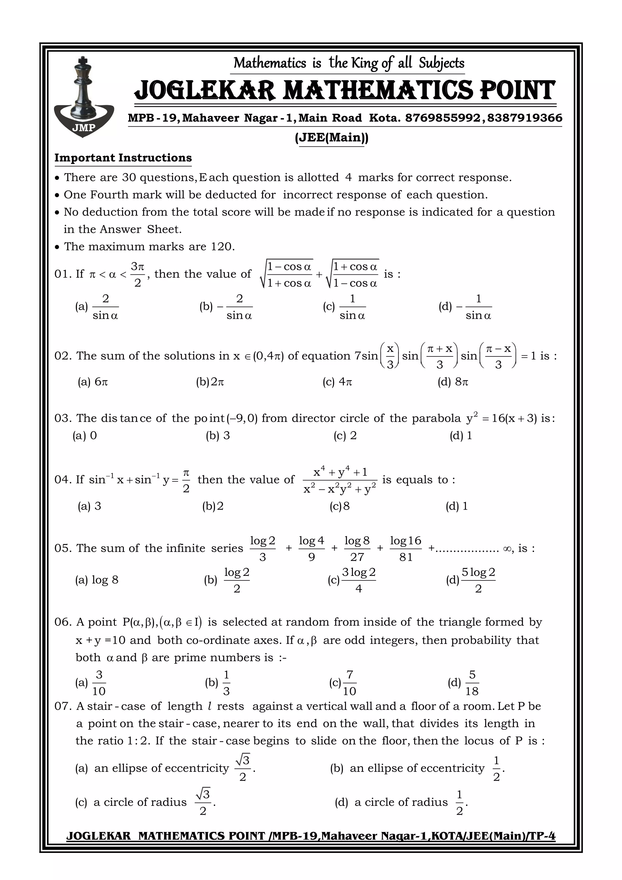 This document provides 30 mathematics questions with multiple choice answers for a JEE Main exam practice test. It includes instructions that there are 120 total marks, each question is worth 4 marks, and a 1/4 mark deduction for incorrect answers. The questions cover a range of mathematics topics including trigonometry, coordinate geometry, algebra, calculus, and probability.