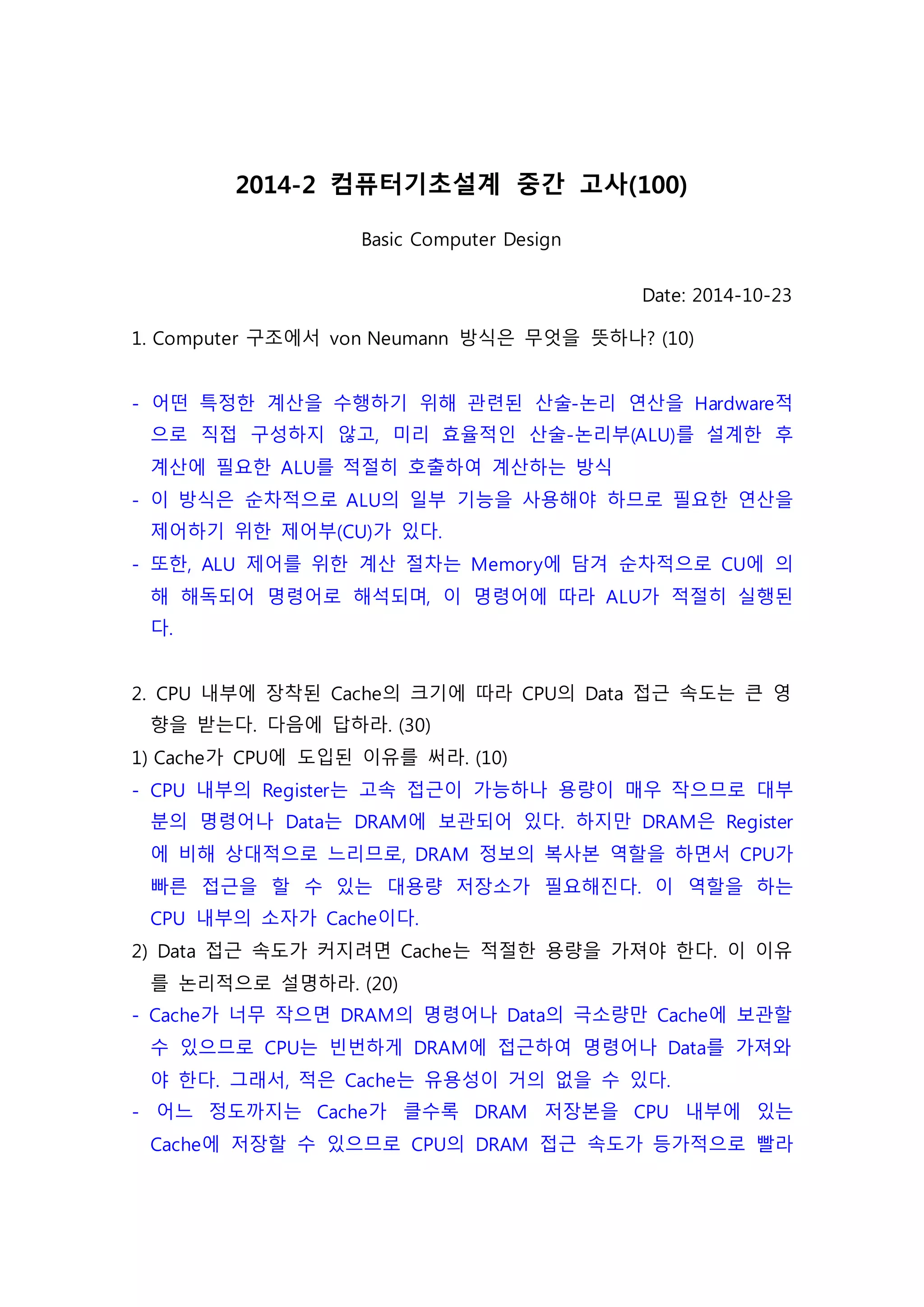 1) Cache가 CPU에 도입된 이유를 써라. (10)