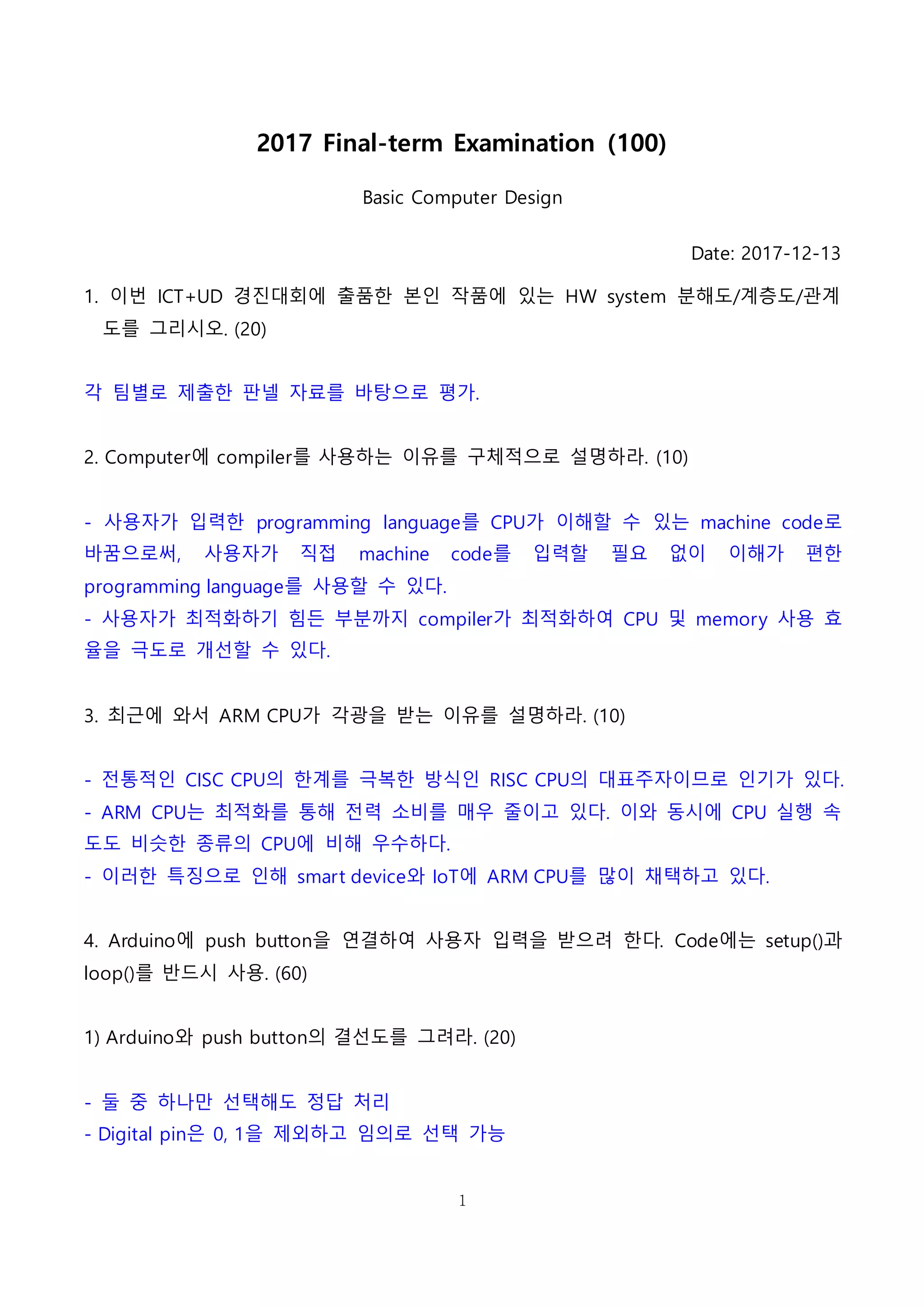 1) Arduino와 push button의 결선도를 그려라. (20)