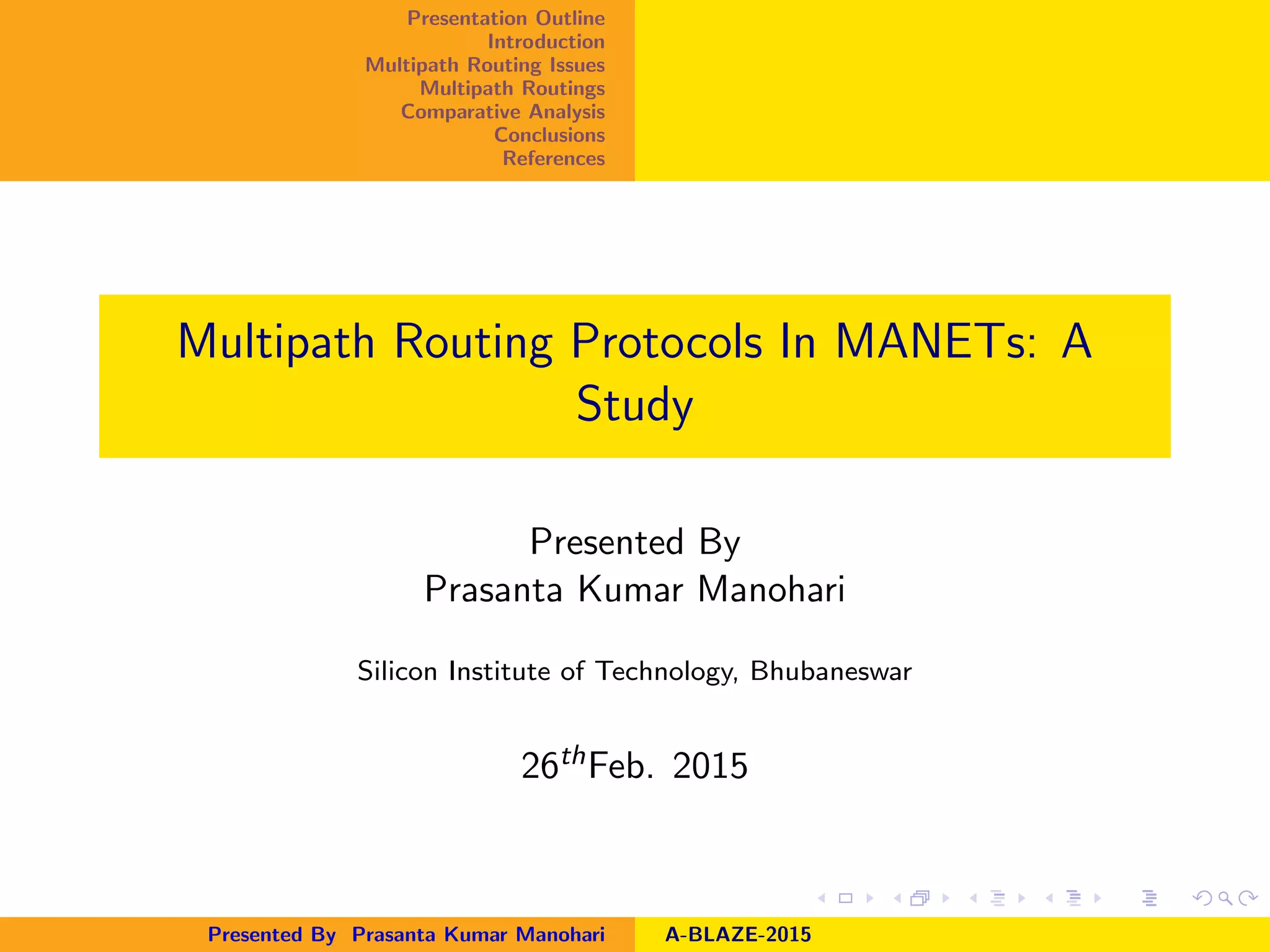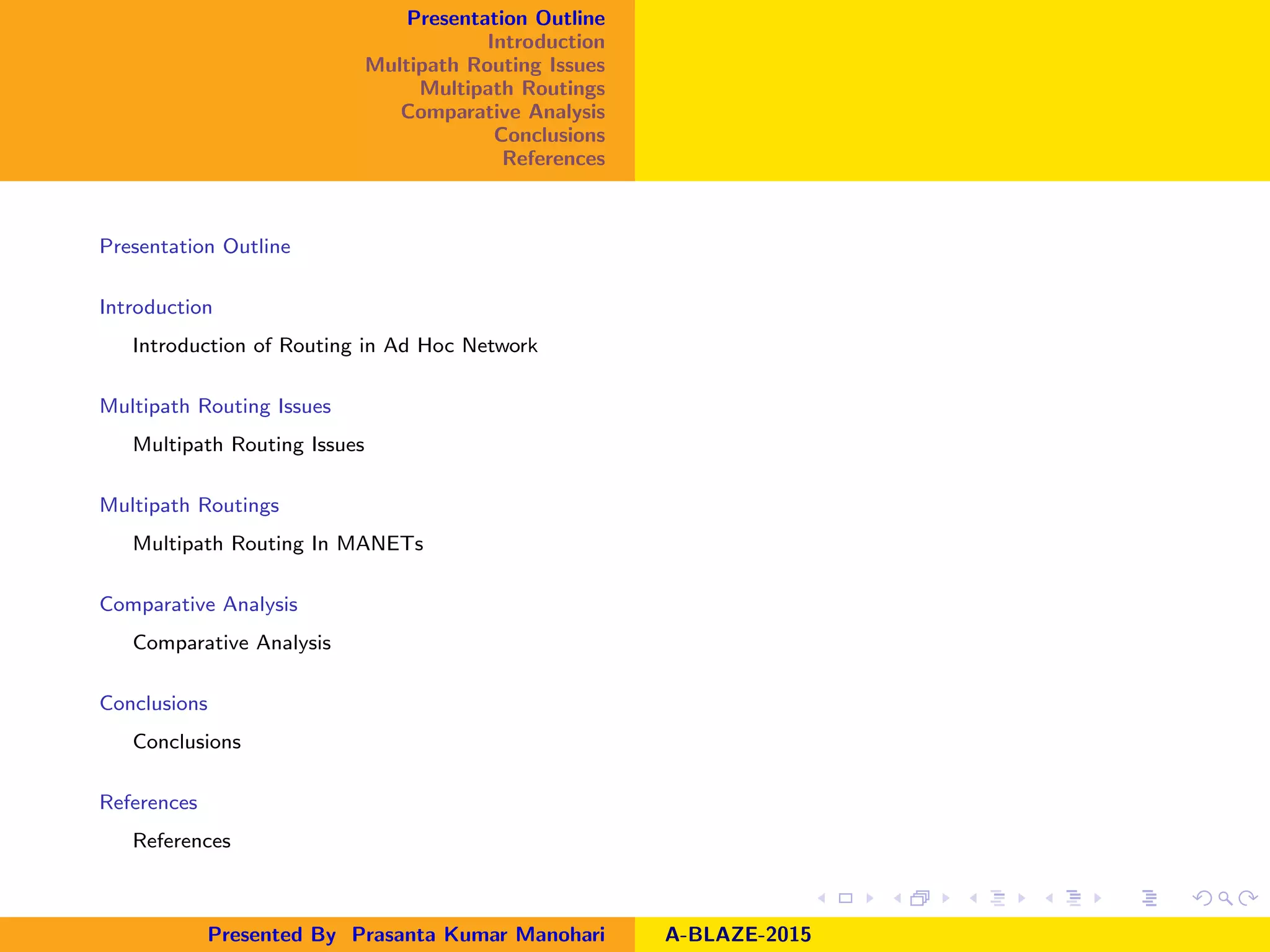 This document is the presentation outline for "Multipath Routing Protocols In MANETs: A Study" presented by Prasanta Kumar Manohari. The outline includes sections on introduction, multipath routing issues, multipath routings, comparative analysis, conclusions, and references. It provides an overview of routing in mobile ad hoc networks, issues with multipath routing, examples of multipath routing protocols based on AODV, DSR, and hybrid approaches, and a comparative analysis of these protocols.