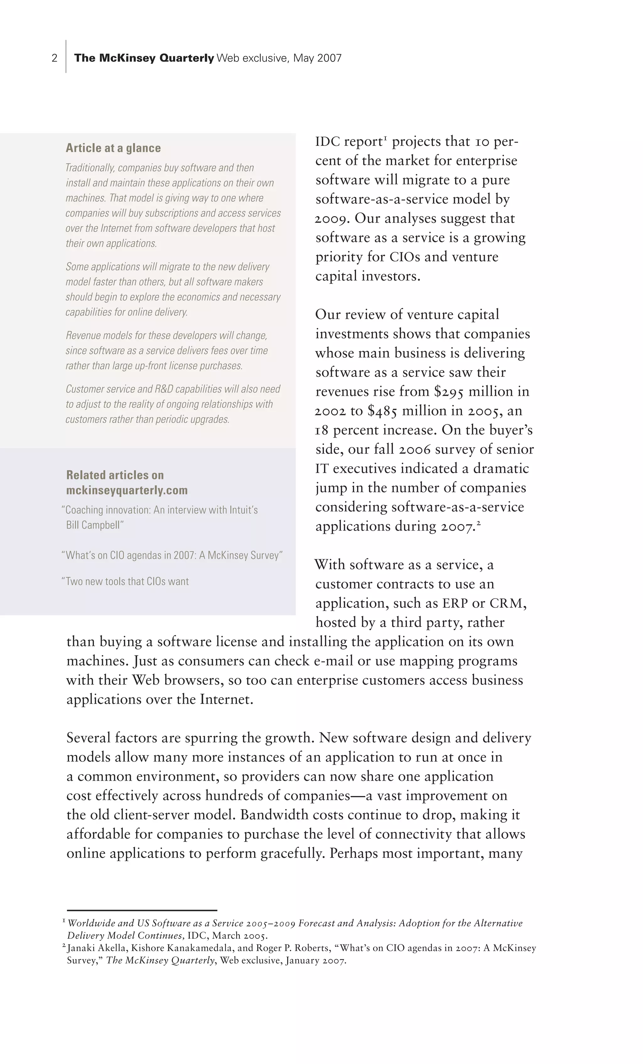 - 10% of the enterprise software market is projected to shift to pure SaaS models by 2009. Venture capital investment in SaaS companies has also risen significantly from 2002-2005.
