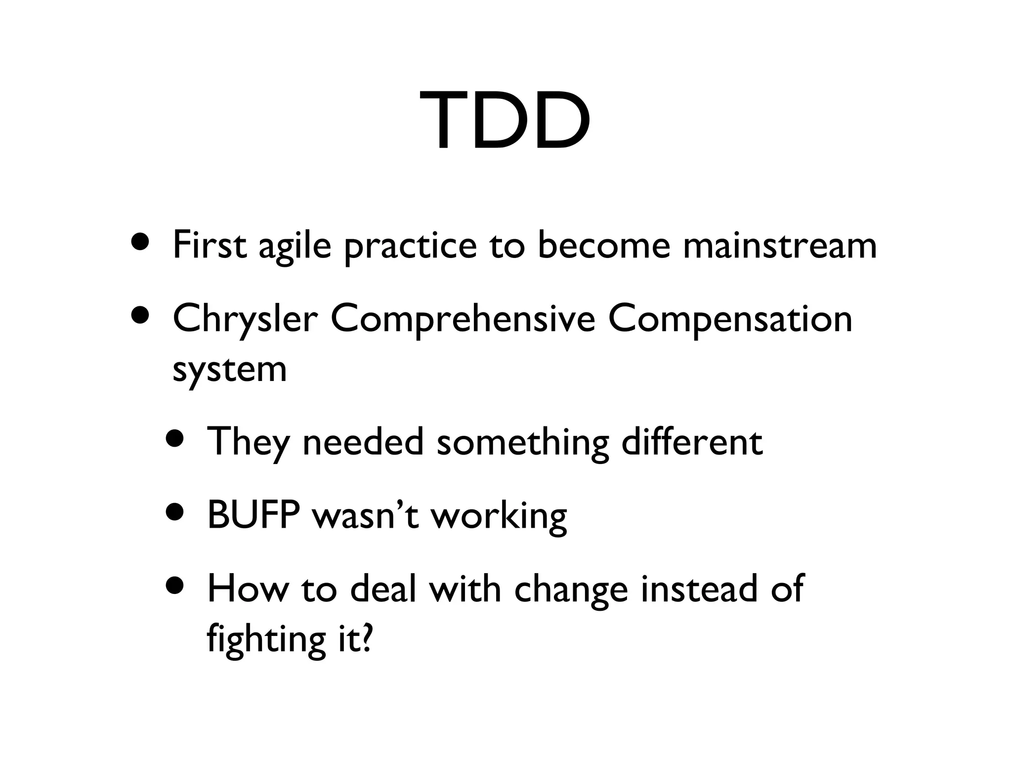 The document discusses test-driven development (TDD) and how it can be used to reduce unnecessary complexity, also known as inventory, in software design. TDD involves writing automated tests before code to articulate requirements and ensure only needed code is written. It promotes designing simple, clear code without duplication through principles like You Aren't Gonna Need It and refactoring code in small, reversible steps. Following TDD principles is claimed to reduce inventory created by excess complexity and allow designs to evolve incrementally based on test feedback.