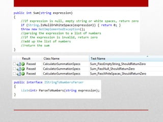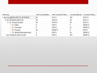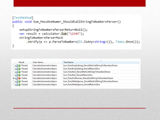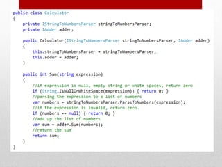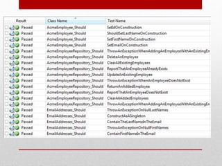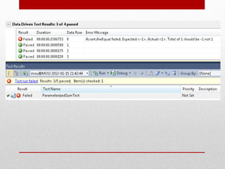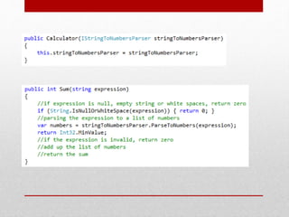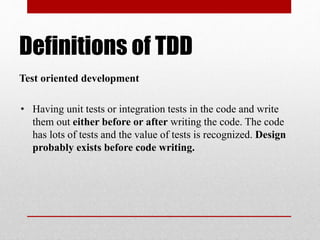 This document discusses definitions, principles, and best practices of test-driven development (TDD). It defines different types of TDD like test-oriented development, test-driven design, acceptance TDD, and developer TDD. The key principles of TDD discussed are red-green-refactor cycles, writing tests before code, and values like improved design, code quality, and maintenance. Guidelines around trustworthy, maintainable and readable unit tests are also provided.