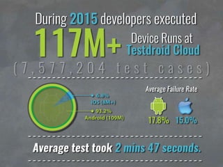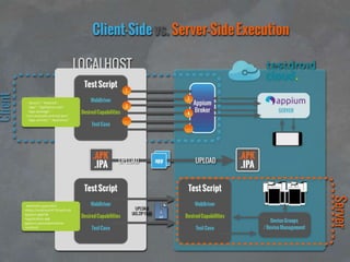 The document discusses Bitbar's mobile app testing solutions, which include public, private, and on-premise device clouds to facilitate automated testing on real Android and iOS devices. It highlights the advantages of cloud testing, such as reduced infrastructure investment, faster deployment, and support for multiple testing tools, while addressing challenges like fragmentation and the necessity of real device testing. Additionally, it details the automated testing frameworks supported by Bitbar and provides insight into client-side execution of test scripts in a cloud environment.