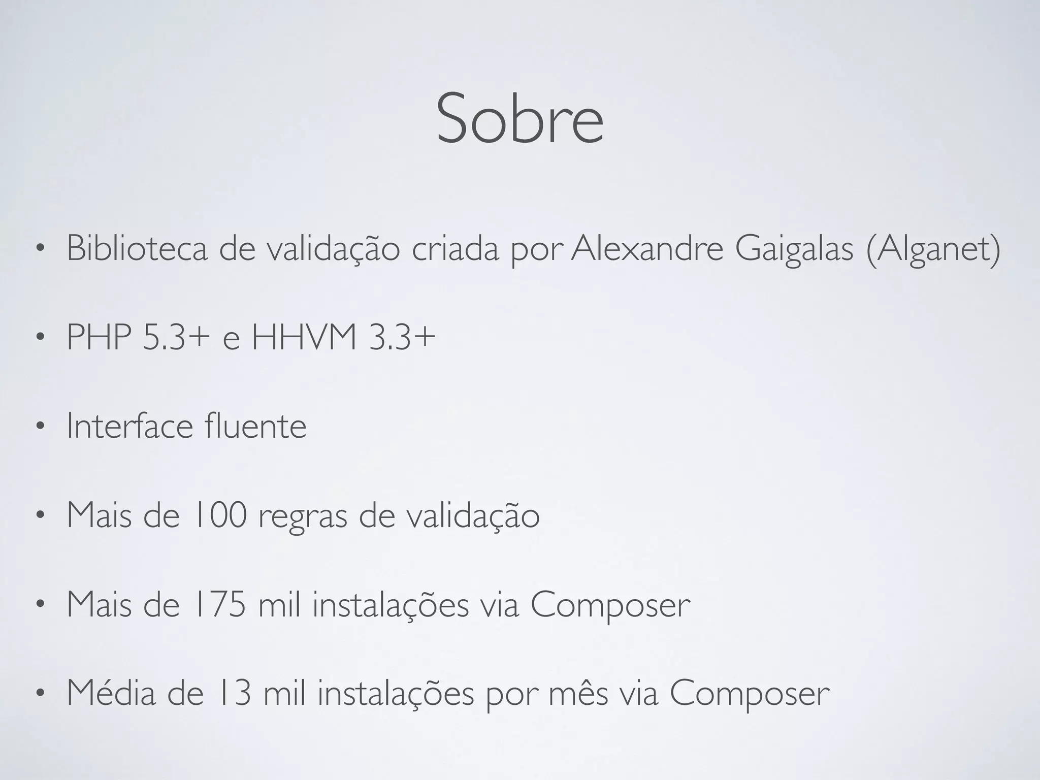 Respect\Validation is a PHP validation library that provides over 100 validation rules and fluent validation methods. It allows validating data using intuitive method chaining and provides custom validation messages. The library has over 175,000 installations via Composer and averages 13,000 new installations per month. It can be used to validate data from $_POST in several frameworks like Zend, Symfony, and Laravel. The library also supports custom validation rules, internationalization, and unit testing of rules.