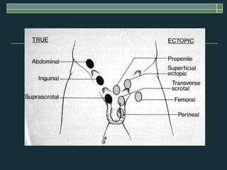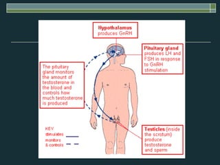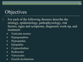 The document discusses several male genital disorders including testicular torsion, hypogonadism, hypospadias, epispadias, cryptorchidism, hydroceles, varicoceles, and erectile dysfunction. For each condition, it describes the etiology, signs and symptoms, diagnostic evaluation, and treatment options. The document provides clinical details to help identify these conditions and manage patients.