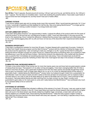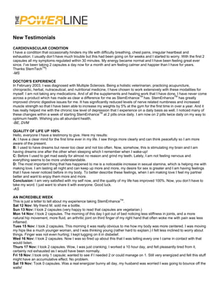 The document contains testimonials from multiple individuals describing positive effects experienced after taking StemTech supplements. A cardiovascular condition was regulated, energy increased. Multiple sclerosis symptoms improved. Quality of life increased 100%. Joint stiffness and pain decreased, energy and sexual stamina increased. Chronic fatigue and headaches disappeared after exercise. Inflammation reduced, allowing increased activity. Back pain disappeared. Sleep and focus improved, leg cramps stopped. Overall, the testimonials describe a variety of physical and mental benefits experienced by taking StemTech supplements.