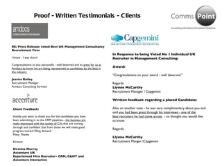 The document contains testimonials from clients and candidates who worked with Comms Point Recruitment Solutions. Clients praise Craig for his dedication, understanding their needs, and delivering high quality candidates. Candidates found Craig helpful in preparing them for interviews, landing multiple job offers, and maintaining contact even when opportunities did not work out initially. One client notes Craig delivered 40% of their permanent hires.