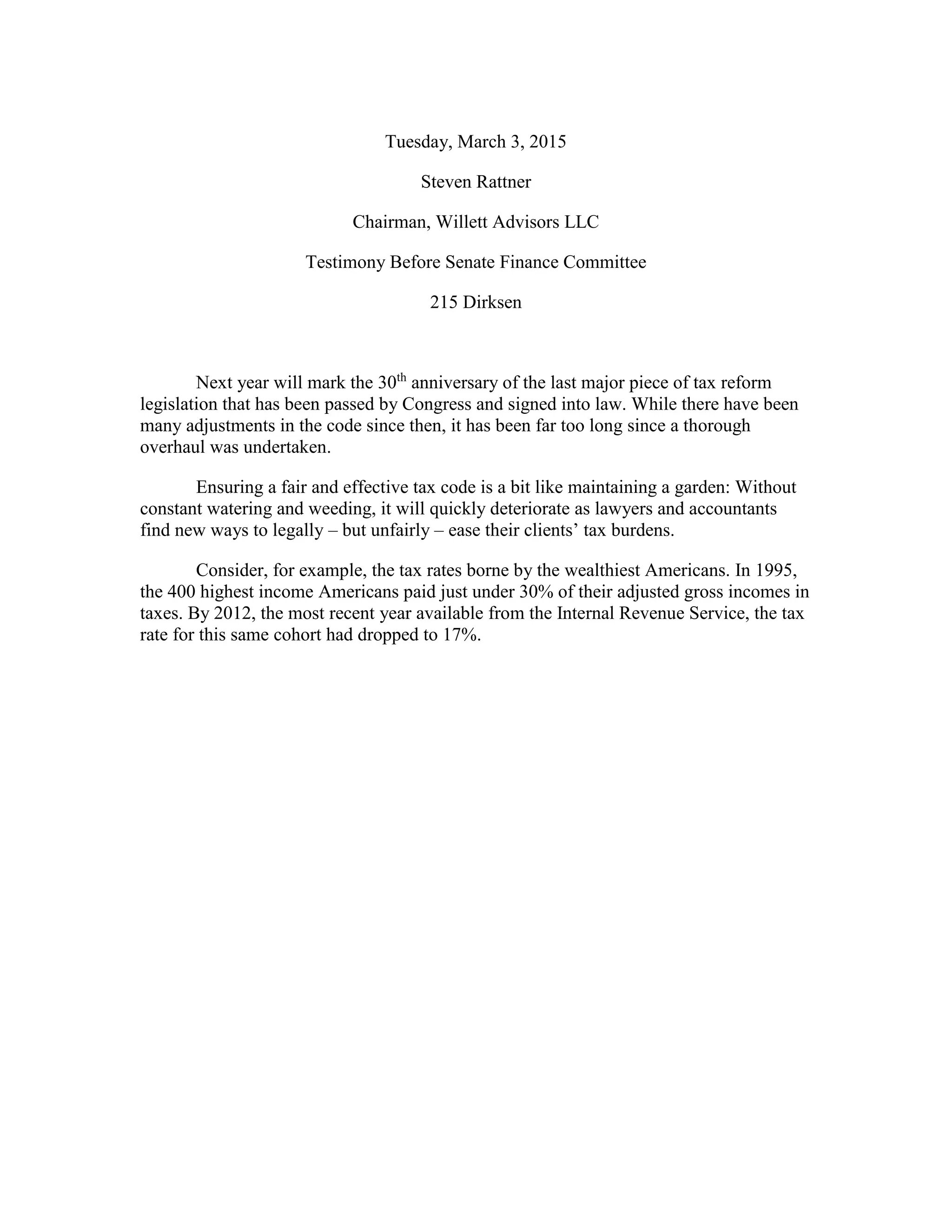 Steven Rattner testified before the Senate Finance Committee on the need for tax reform. He argued that the tax code has deteriorated without reform in over 30 years, allowing lawyers and accountants to legally ease tax burdens for their wealthy clients. For example, the 400 highest income Americans saw their tax rate drop from 30% to 17% from 1995 to 2012 due largely to low capital gains and dividend rates. Rattner advocated achieving greater fairness and revenue by reducing the number of tax rates, eliminating special treatment of capital gains and dividends, and reducing loopholes that disproportionately benefit the wealthy.