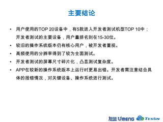 2012年用户设备使用行为及开发者测试报告揭示了用户和开发者关注的主要Android设备及系统版本。报告指出老旧操作系统仍有核心用户,开发者面临的测试环境复杂性增加,包括设备品牌与分辨率的多样性。综合数据显示,更高的操作系统版本运行时更易出错,开发者在测试时需重视新旧设备的兼容性。