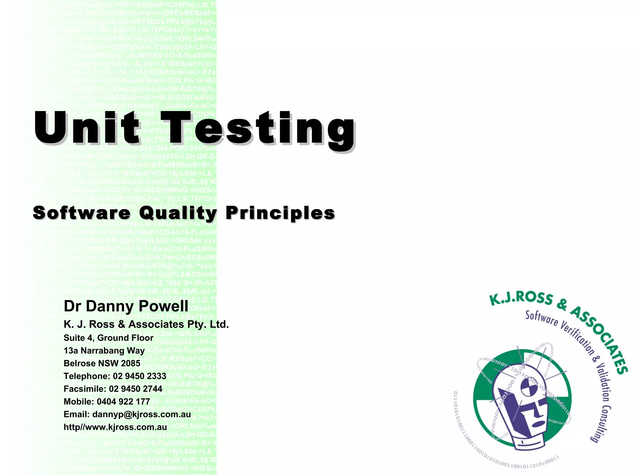 The document discusses unit testing and software quality principles. It describes how unit testing checks that individual units of code are working properly. Regular unit testing can help improve software quality and identify problems early in the development process.