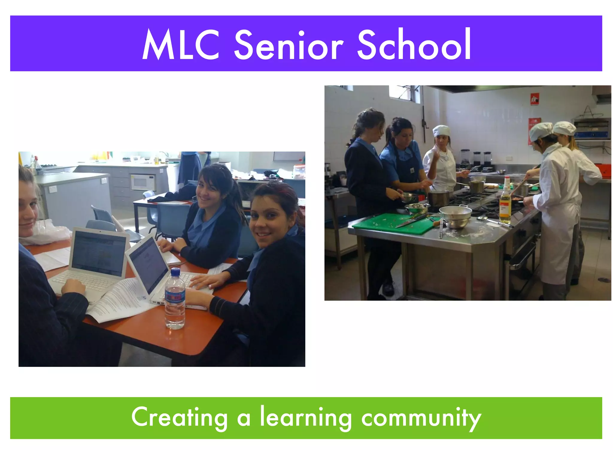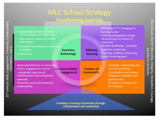 This document outlines the goals and priorities of MLC Senior School for the 2008/9 year. It discusses transforming learning, values, and learning goals for years 9-10 including laboratory, enlightenment, student voice, and leadership. It asks where the school is in relation to its goals, what is working well, and priorities for learning teams this term and tomorrow. It quotes that the quality of an education system cannot exceed the quality of its teachers.