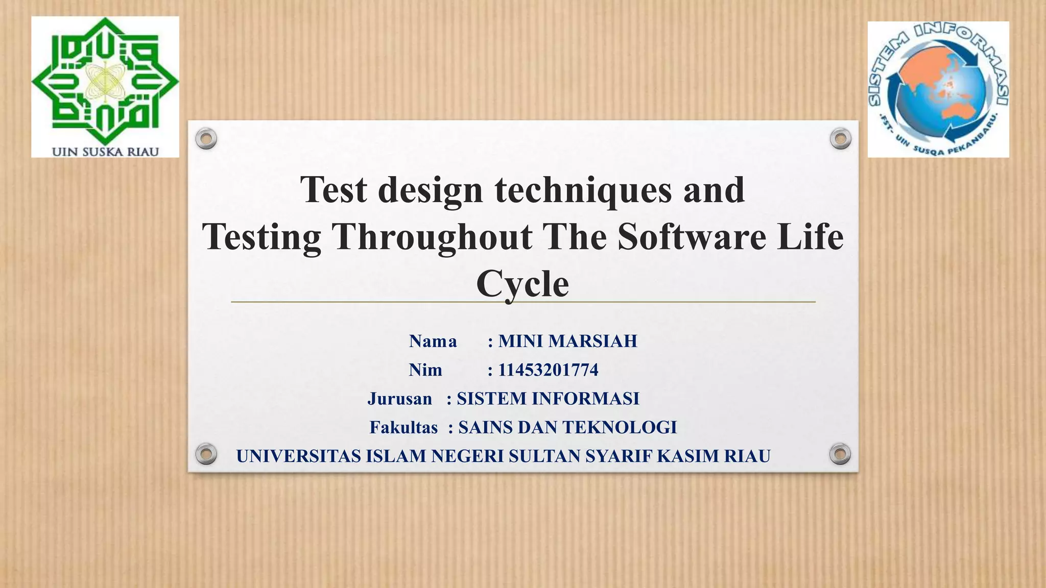 This document discusses testing throughout the software development life cycle. It describes the V-model approach, which involves testing beginning early in the development process and continuing through later stages. The V-model includes four main test levels - component testing, integration testing, system testing, and acceptance testing - each with their own objectives to verify and validate different parts or the overall system. Testing activities should be carried out in parallel with development and involve collaboration between testers and developers.