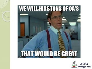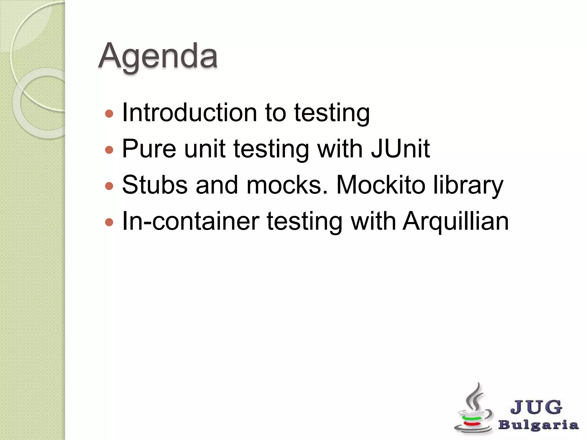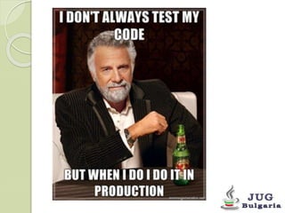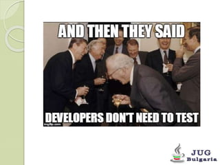 The document outlines the principles and processes of unit testing, emphasizing the use of the JUnit framework and mocking libraries like Mockito within container environments using Arquillian. It elaborates on the benefits and limitations of unit testing, providing guidance on test preparation, execution, and the importance of dependency injection. Additionally, it offers a structured five-step approach to connecting, packaging, and running tests in various container platforms.