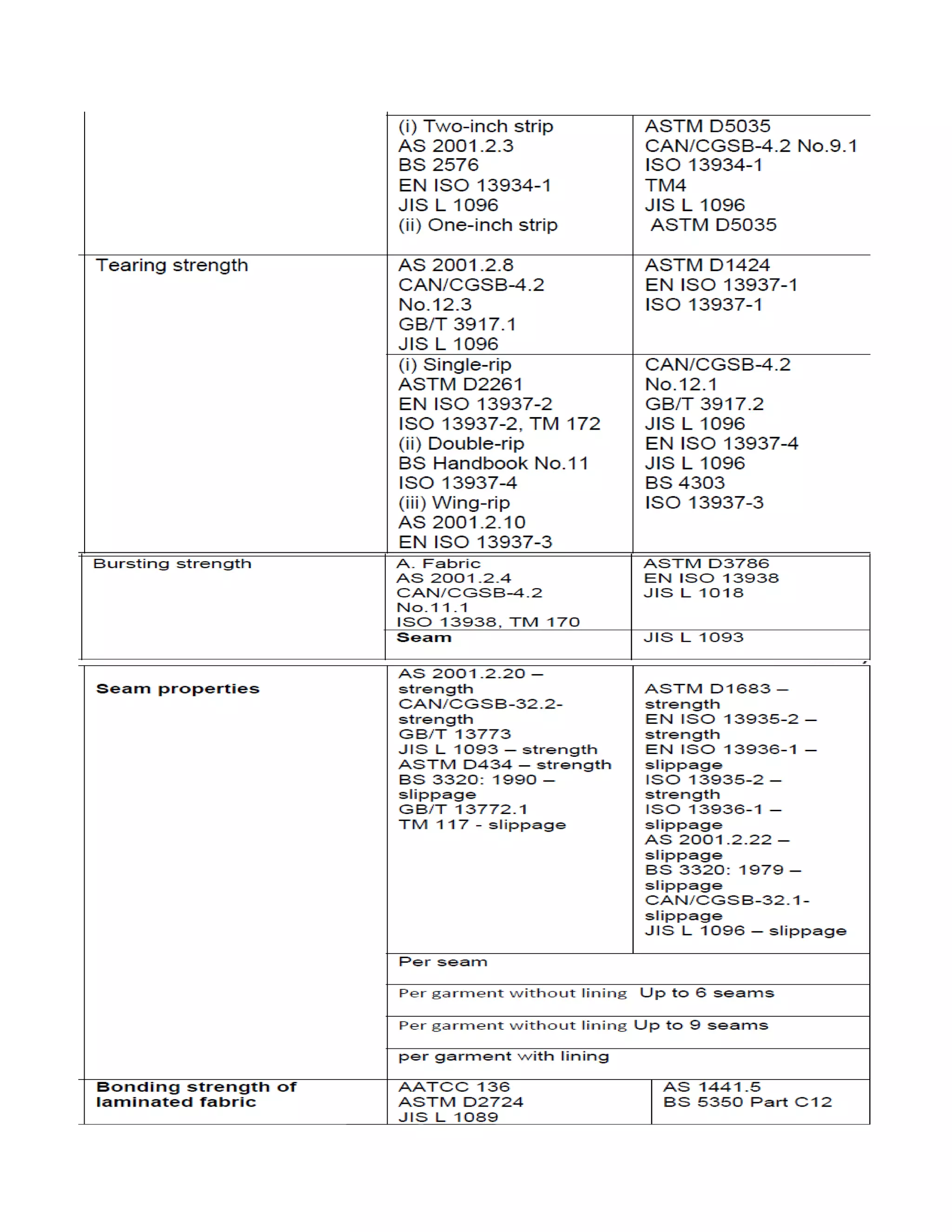 The document outlines the importance of textile testing and product quality in the apparel industry, detailing the processes and standards for evaluating various textile properties. It includes specific testing methods for tensile strength, tearing strength, bursting strength, and seam slippage, among others, highlighting the significance of these tests in assessing fabric performance. Comprehensive information on standards, test conditions, and allowable limits is also provided to ensure quality compliance.