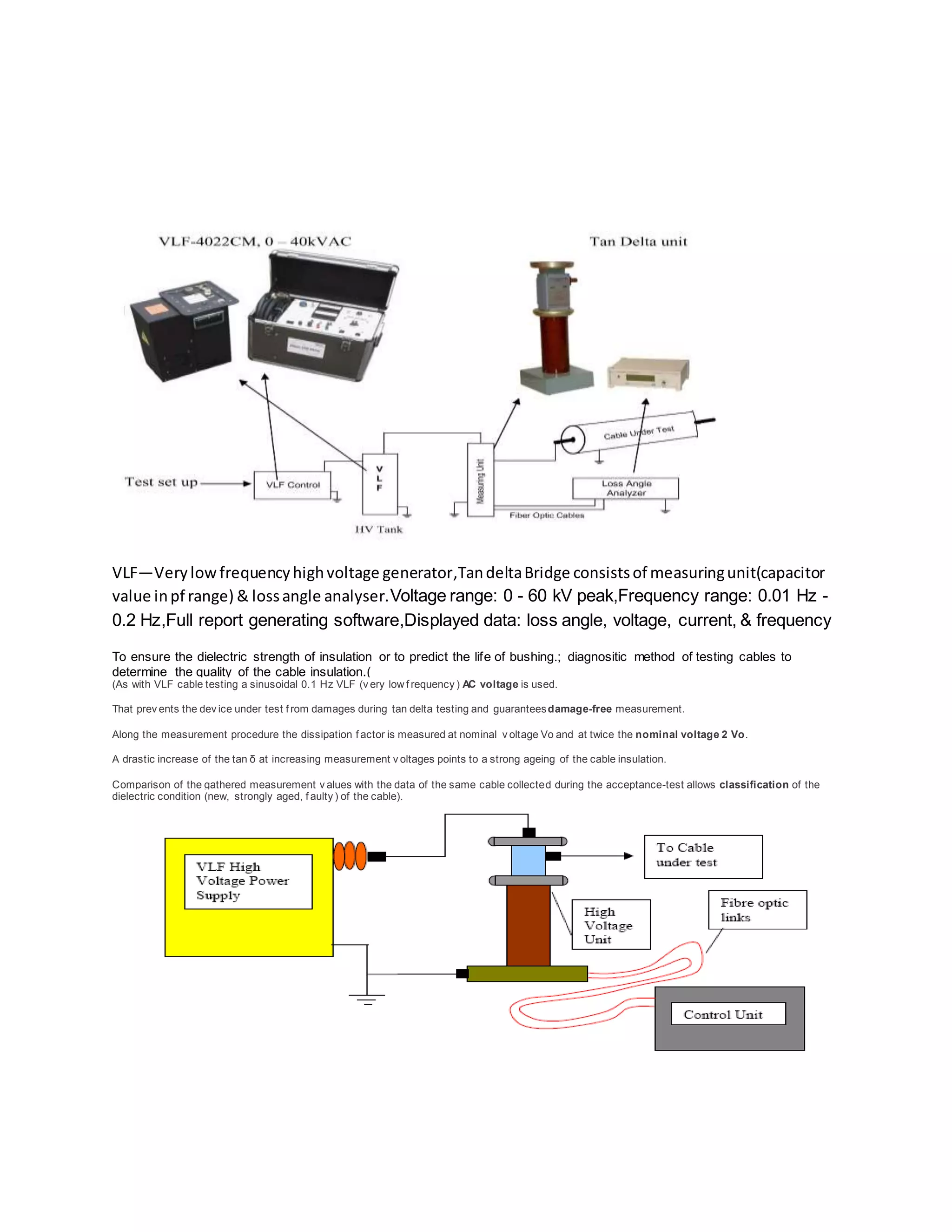 1) Tan delta testing uses a very low frequency AC voltage to measure the dissipation factor of insulation to determine its quality and condition. A higher loss angle indicates more contamination.