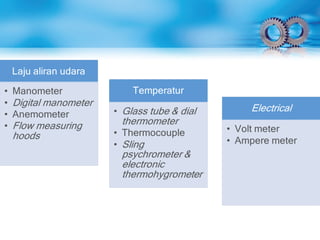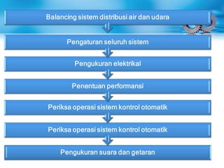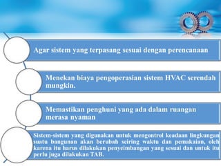 Dokumen ini menjelaskan tentang Testing, Adjusting, dan Balancing (TAB) dalam sistem tata udara, yang meliputi pengujian performansi, pengaturan aliran udara, dan penyeimbangan distribusi. TAB dilakukan pada sistem baru, saat ada perubahan peruntukan ruang, atau penggantian peralatan. Dalam proses ini, lembaga independen melakukan pengukuran dan memberikan laporan untuk memastikan sistem sesuai dengan rancangan dan spesifikasi awal.