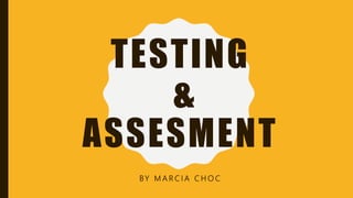 This document discusses testing, assessment, and evaluation in educational systems. It defines key terms like testing, assessment, and evaluation. It also describes different types of common tests for primary students like placement, diagnostic, and progress tests. The document outlines characteristics of good tests, such as construct validity, face validity, reliability, and practicality. Finally, it provides examples of different types of tests, including labeling, cloze, matching, multiple choice, true or false, numbering items in sequence, question and answer, and sentence writing/completion tests.
