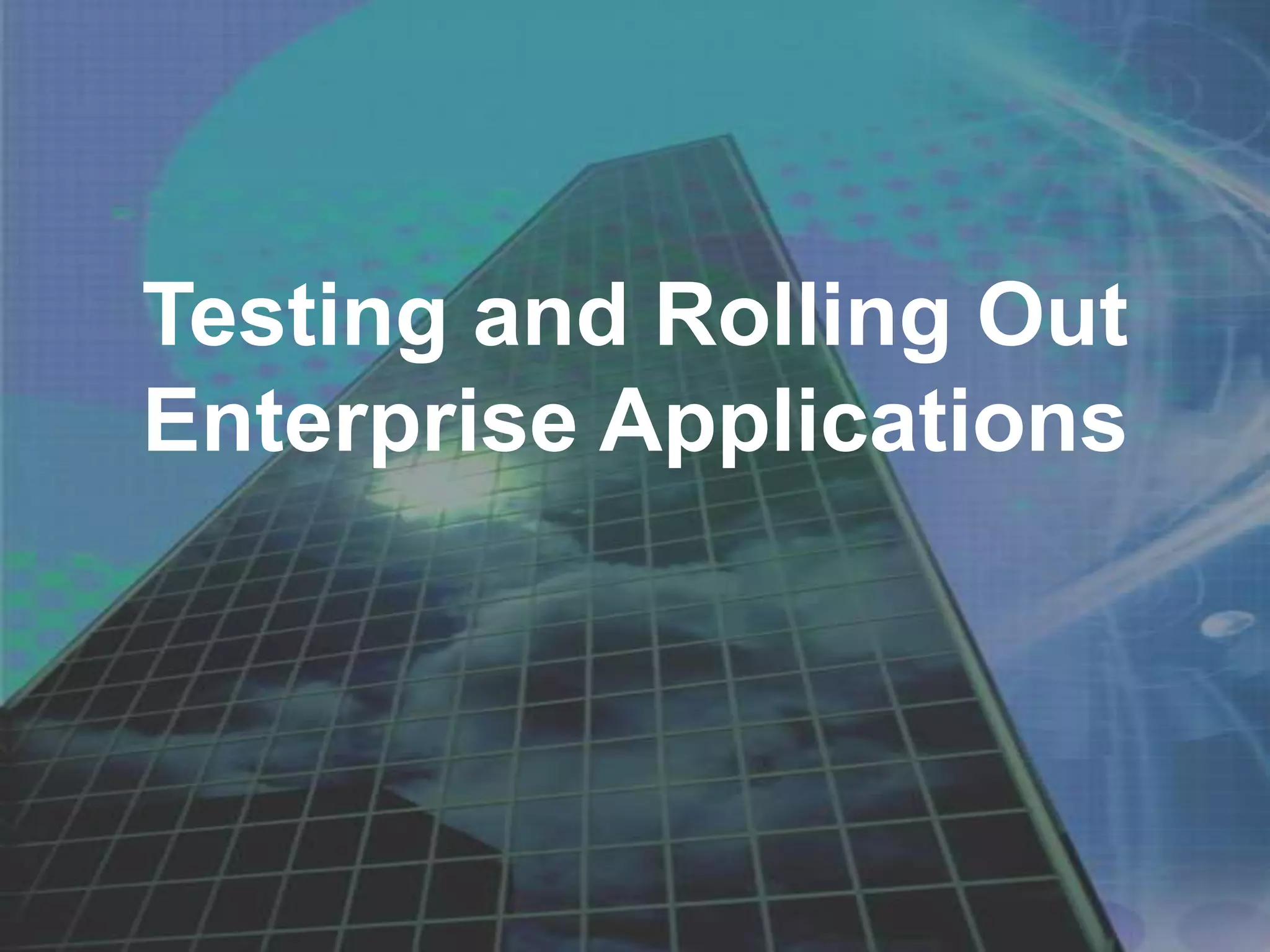 The document discusses various aspects of testing and rolling out enterprise applications. It describes different types of testing like functional testing, non-functional testing, white box testing, black box testing and gray box testing. It also discusses different testing levels from unit testing to acceptance testing and production testing. The document then covers testing approaches, environments, performance testing and security testing in detail. Finally, it provides an overview of user acceptance testing and strategies for rolling out enterprise applications.