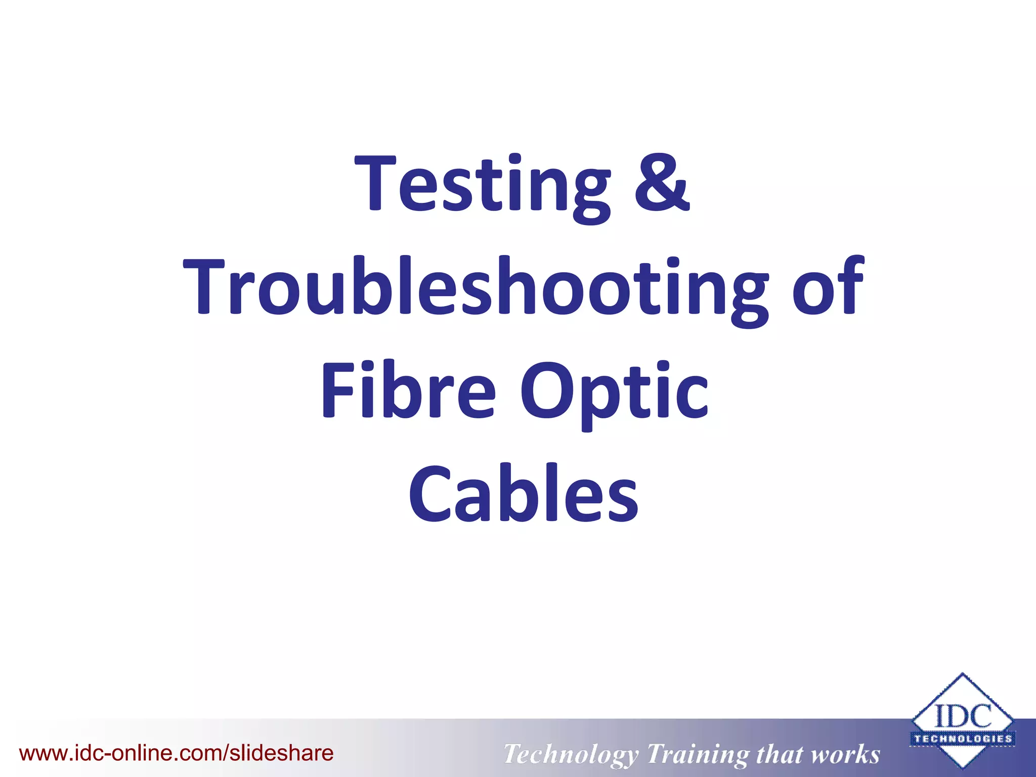 This document discusses testing and troubleshooting of fibre optic cables. It outlines various standard fibre optic cable and equipment tests including transmitter power tests, receiver performance tests, continuity testing, insertion loss testing, and optical time domain reflectometry. It also discusses bit error rate testing, eye diagram analysis, and various laboratory measurements of fibre optic cables and equipment. More information is available at http://www.idc-online.com/slideshare.