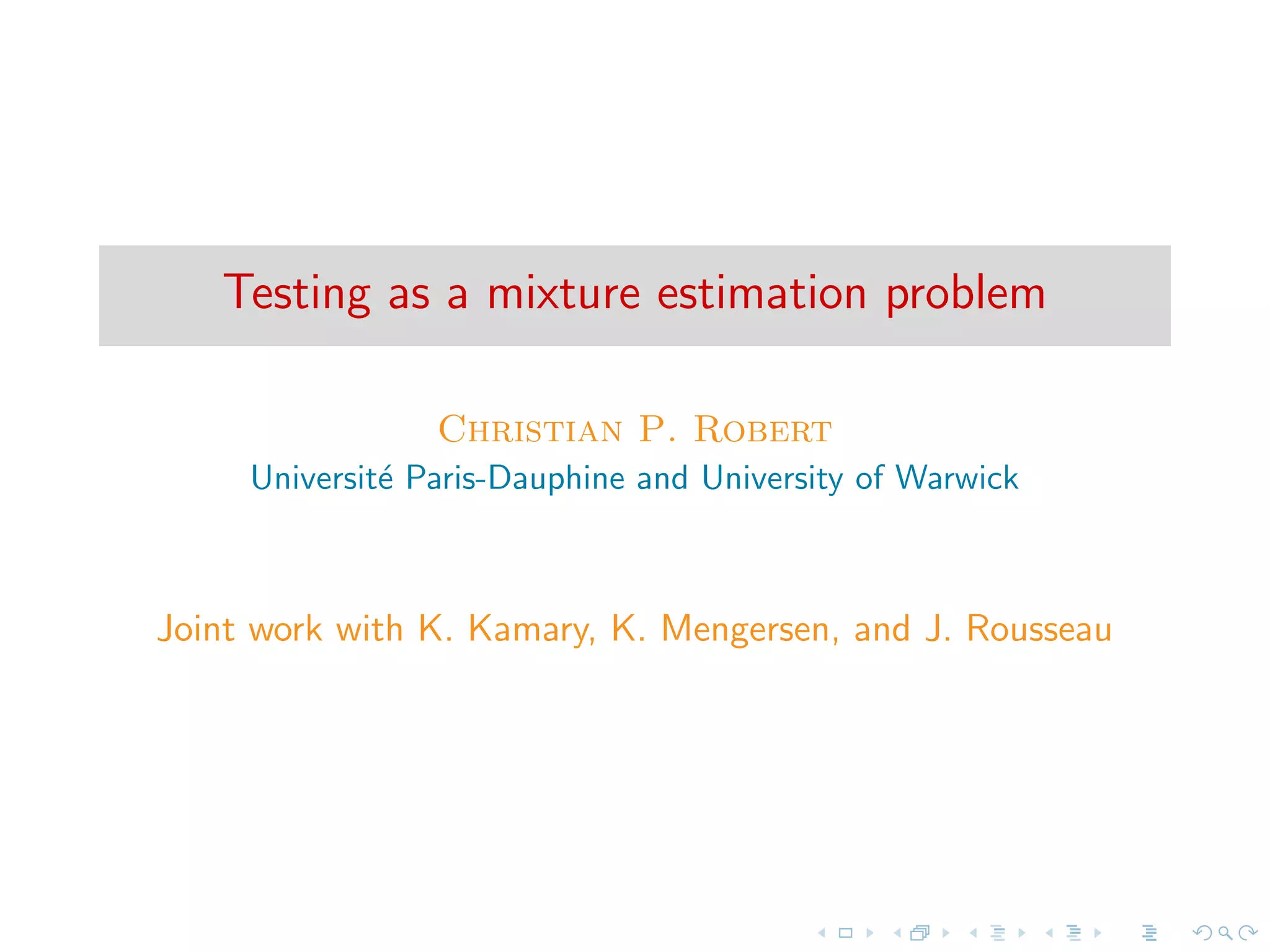 This document proposes representing hypothesis testing problems as estimating mixture models. Specifically, two competing models are embedded within an encompassing mixture model with a weight parameter between 0 and 1. Inference is then drawn on the mixture representation, treating each observation as coming from the mixture model. This avoids difficulties with traditional Bayesian testing approaches like computing marginal likelihoods. It also allows for a more intuitive interpretation of the weight parameter compared to posterior model probabilities. The weight parameter can be estimated using standard mixture estimation algorithms like Gibbs sampling or Metropolis-Hastings. Several illustrations of the approach are provided, including comparisons of Poisson and geometric distributions.