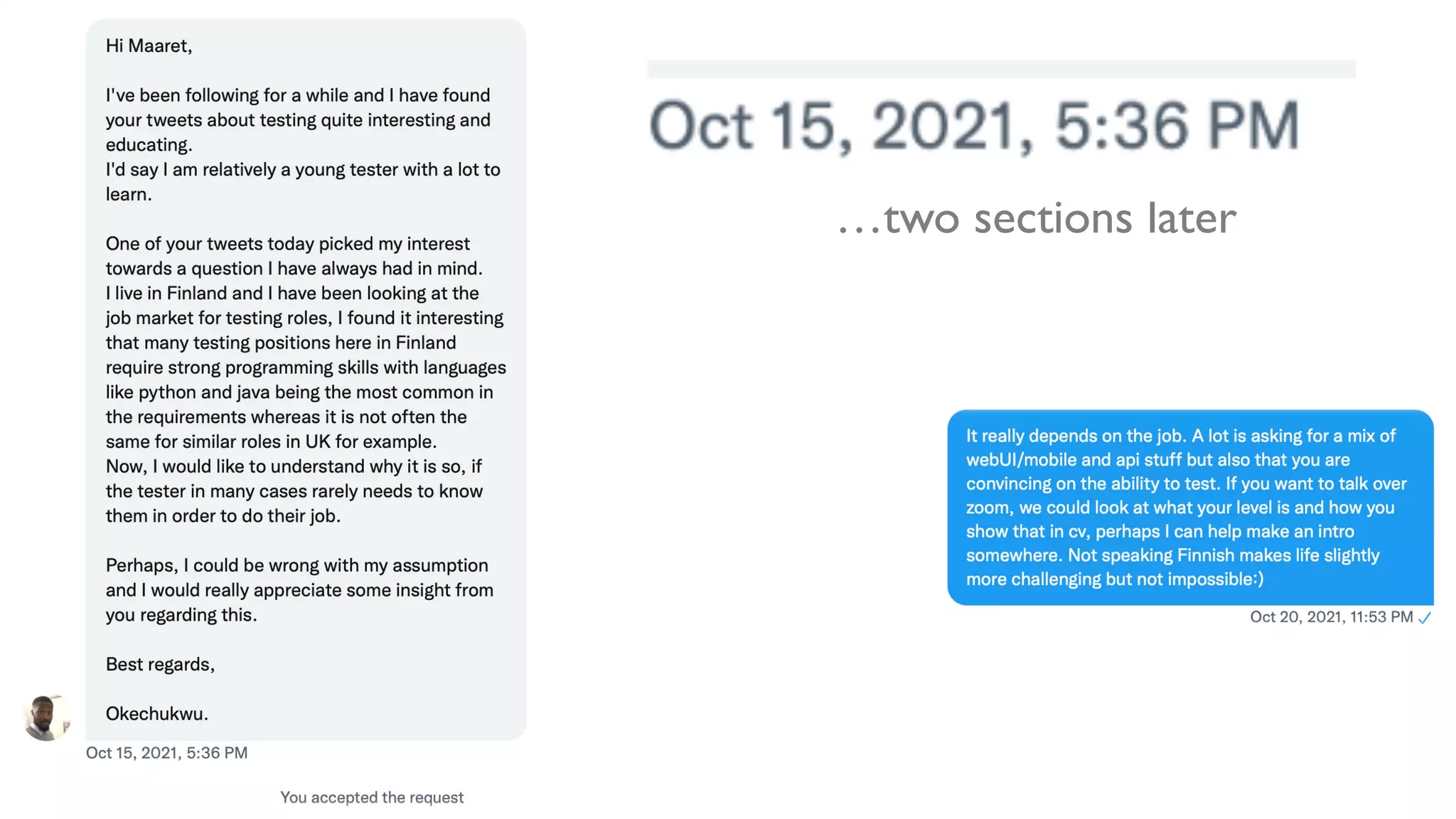 This document discusses insights into becoming a test specialist and building a career in testing. It touches on topics like recognizing testing as a career path, gaining experience and education over time, learning from communities, dealing with imposter syndrome, taking on more responsibility, and balancing different skills like testing, programming, communication and learning. The overarching messages are that gaining experience, learning from others, developing confidence, and staying active in your learning and community can help one succeed in a career in testing.